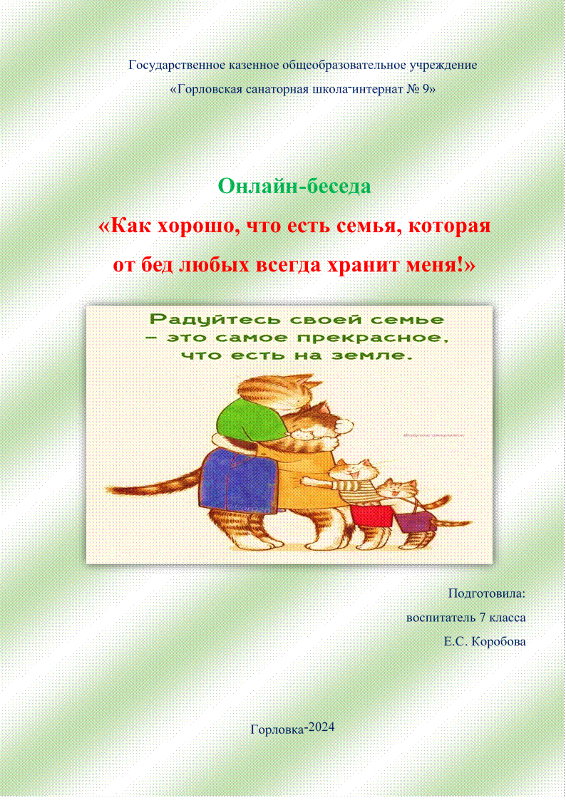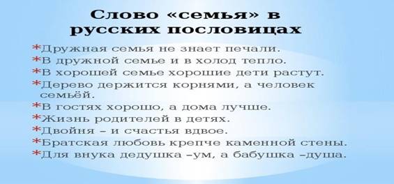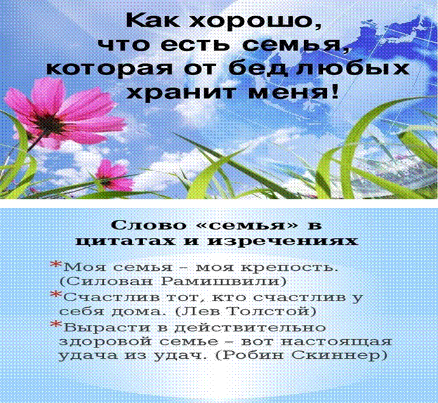 Семья создает у человека понятие дома не как помещения, где он живет, а как чувства, ощущения, где ждут, любят, понимают, защищают. Семья – это такое образование, которое «охватывает» человека целиком во всех его проявлениях.