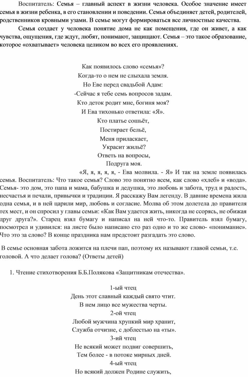 «Я, я, я, я, я, - Ева молвила. - Я» И так на земле появилась семья. Воспитатель: Что такое семья? Слово это понятно всем, как слово «хлеб» и «вода». Семья- это дом, это папа и мама, бабушка и дедушка, это любовь и забота, труд и радость, несчастья и печали, привычки и традиции. Я расскажу Вам легенду. В давние времена жила одна семья, и в ней царили мир, любовь и согласие. Молва об этом долетела до правителя тех мест, и он спросил у главы семьи: «Как Вам удается жить, никогда не ссорясь, не обижая друг друга?». Старец взял бумагу и написал на ней что-то. Правитель взял бумагу, посмотрел и удивился: на листе было написано сто раз одно и то же слово- «понимание». Что это за слово? В конце праздника нам предстоит разгадать это слово.