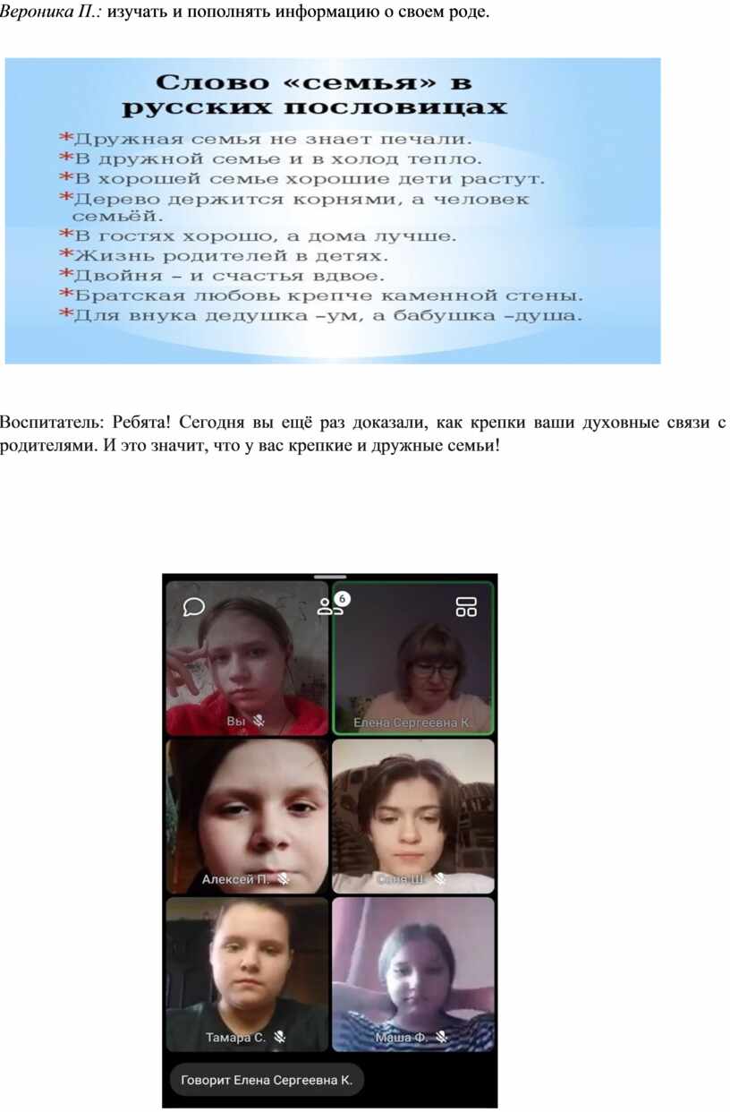 Воспитатель: Ребята! Сегодня вы ещё раз доказали, как крепки ваши духовные связи с родителями. И это значит, что у вас крепкие и дружные семьи!