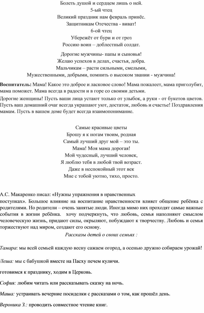 поступках». Большое влияние на воспитание нравственности влияет общение ребёнка с родителями. Но родители – очень занятые люди. Иногда мимо них проходят самые важные события в жизни ребёнка. хочу подчеркнуть, что любовь, семья наполняют смыслом человеческую жизнь, придают силы, окрыляют, побуждают к творчеству. Любовь и семья торжествуют над миром, создают его основу.