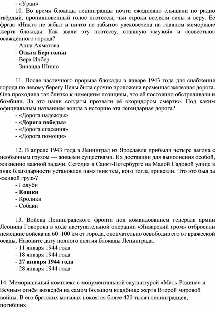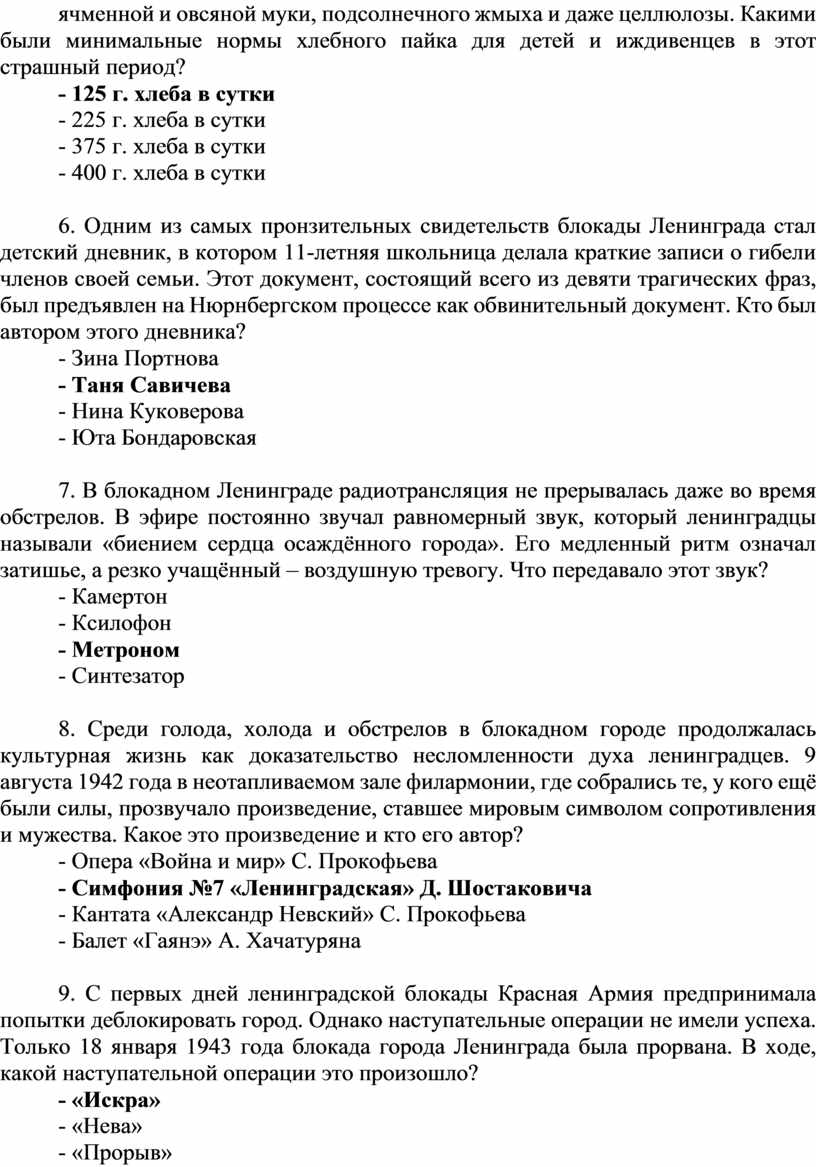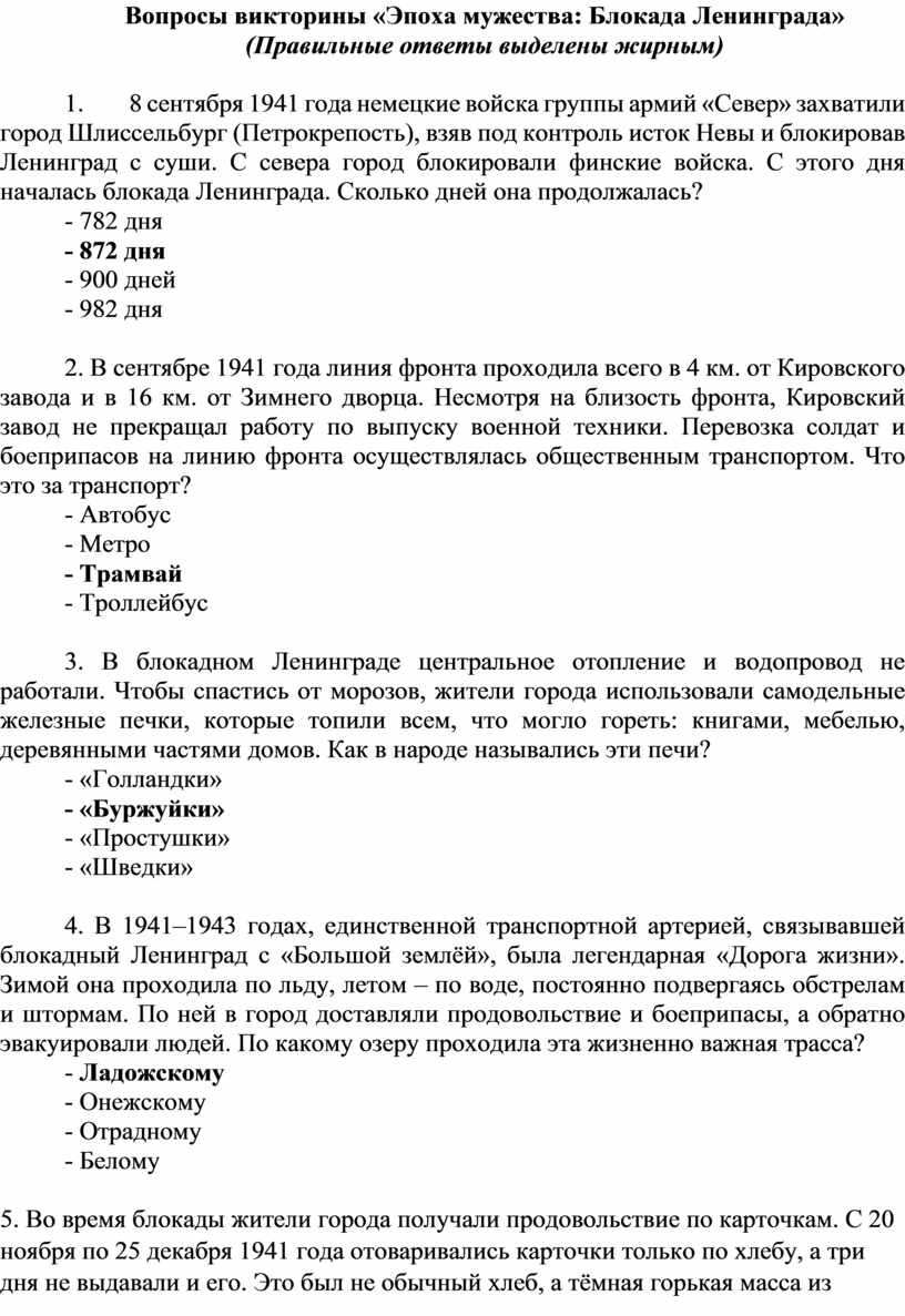 Вопросы викторины «Эпоха мужества: Блокада Ленинграда»