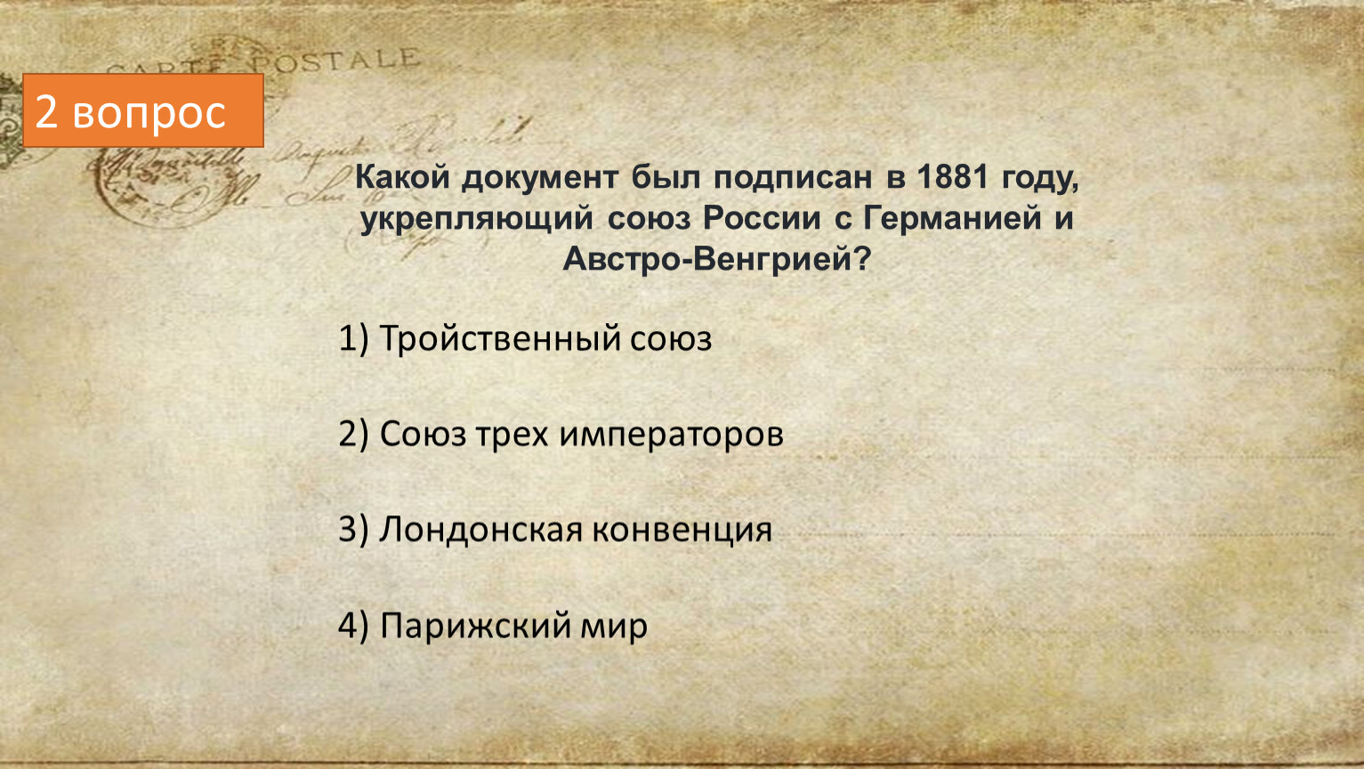 Какой документ был подписан в 1881 году, укрепляющий союз России с Германией и Австро-Венгрией?