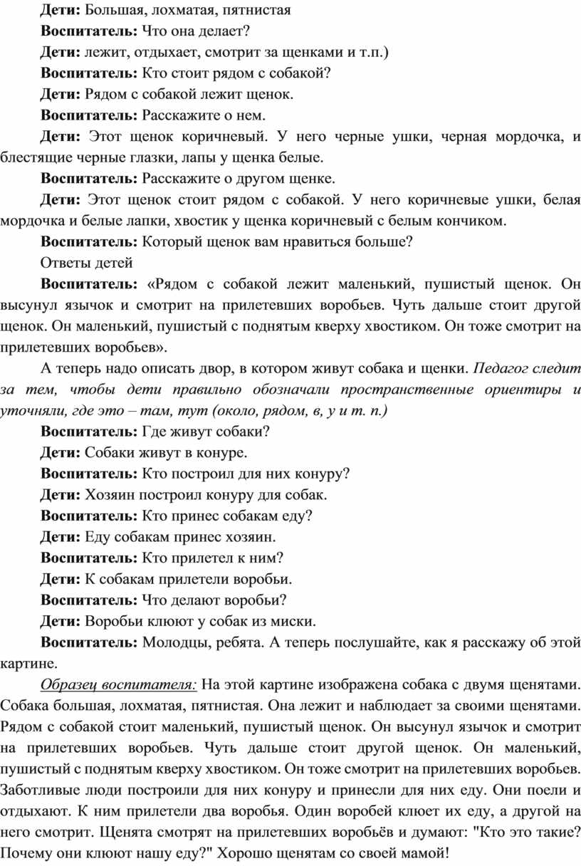 Образец воспитателя: На этой картине изображена собака с двумя щенятами. Собака большая, лохматая, пятнистая. Она лежит и наблюдает за своими щенятами. Рядом с собакой стоит маленький, пушистый щенок. Он высунул язычок и смотрит на прилетевших воробьев. Чуть дальше стоит другой щенок. Он маленький, пушистый с поднятым кверху хвостиком. Он тоже смотрит на прилетевших воробьев. Заботливые люди построили для них конуру и принесли для них еду. Они поели и отдыхают. К ним прилетели два воробья. Один воробей клюет их еду, а другой на него смотрит. Щенята смотрят на прилетевших воробьёв и думают: "Кто это такие? Почему они клюют нашу еду?" Хорошо щенятам со своей мамой!