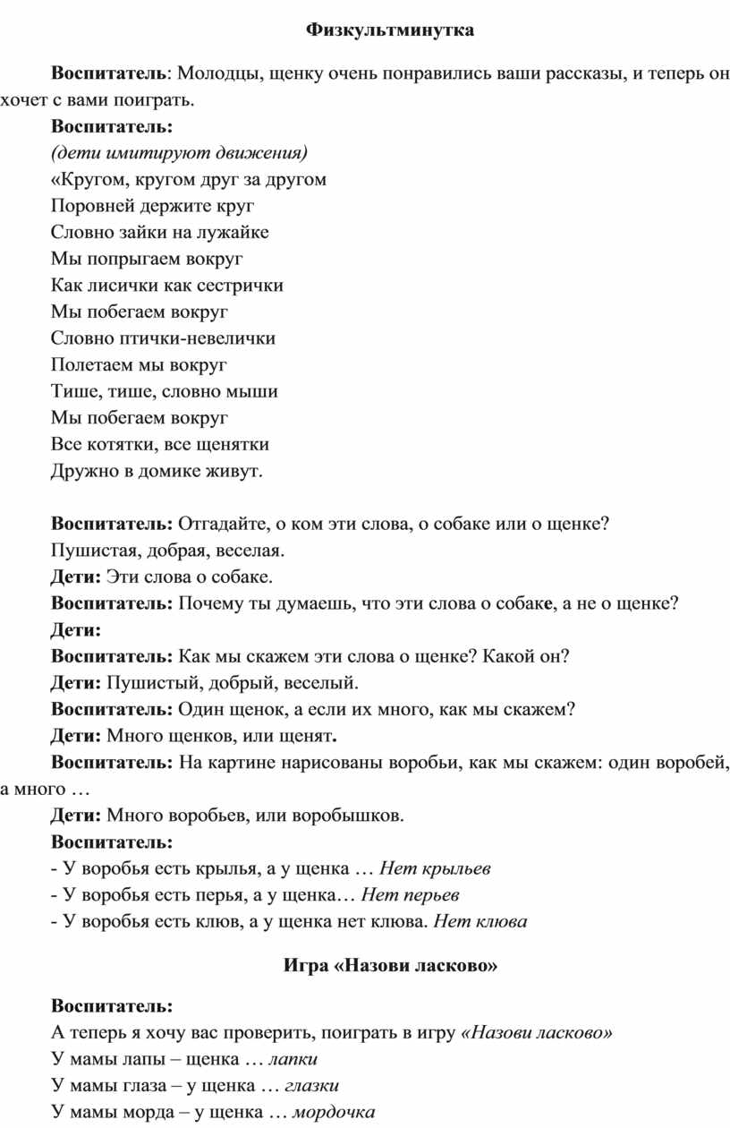 Воспитатель: «Рядом с собакой лежит маленький, пушистый щенок. Он высунул язычок и смотрит на прилетевших воробьев. Чуть дальше стоит другой щенок. Он маленький, пушистый с поднятым кверху хвостиком. Он тоже смотрит на прилетевших воробьев».