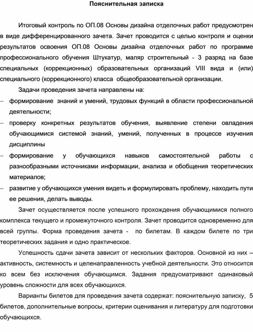 Итоговый контроль по ОП.08 Основы дизайна отделочных работ предусмотрен в виде дифференцированного зачета. Зачет проводится с целью контроля и оценки результатов освоения ОП.08 Основы дизайна отделочных работ по программе профессионального обучения Штукатур, маляр строительный - 3 разряд на базе специальных (коррекционных) образовательных организаций VIII вида и (или) специального (коррекционного) класса общеобразовательной организации.