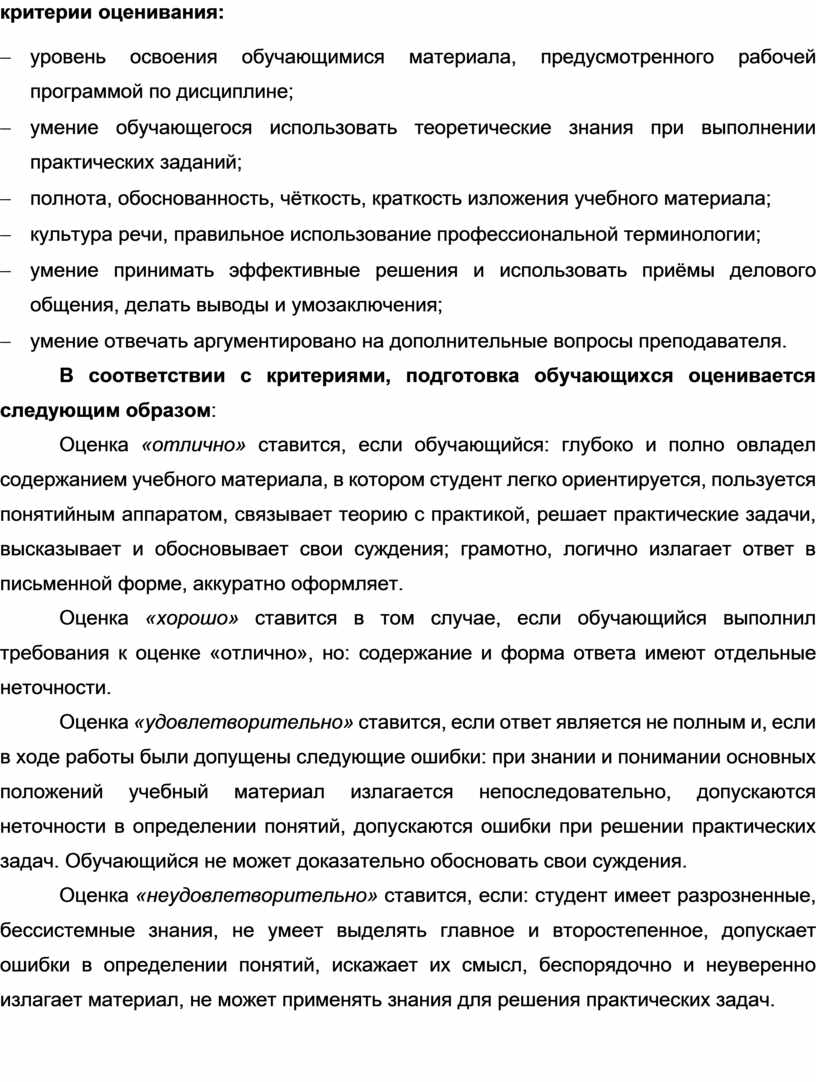 Оценка «неудовлетворительно» ставится, если: студент имеет разрозненные, бессистемные знания, не умеет выделять главное и второстепенное, допускает ошибки в определении понятий, искажает их смысл, беспорядочно и неуверенно излагает материал, не может применять знания для решения практических задач.