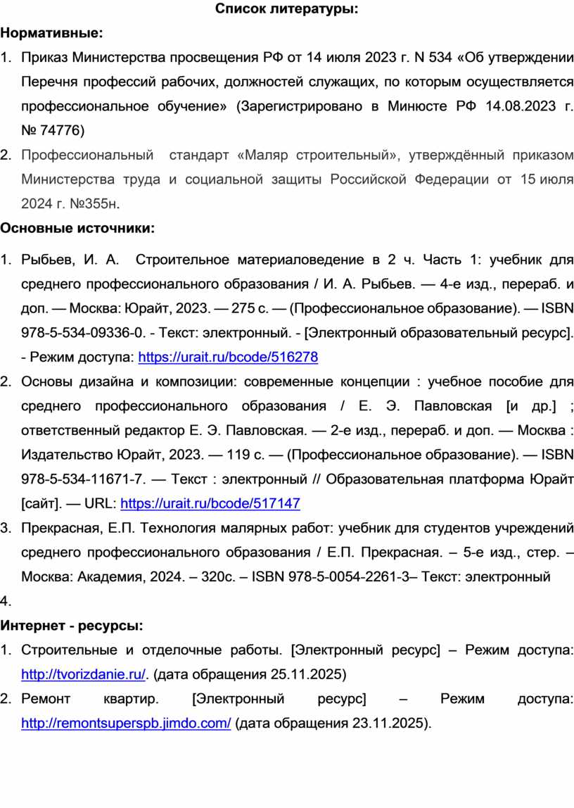 3. Прекрасная, Е.П. Технология малярных работ: учебник для студентов учреждений среднего профессионального образования / Е.П. Прекрасная. – 5-е изд., стер. – Москва: Академия, 2024. – 320с. – ISBN 978-5-0054-2261-3– Текст: электронный