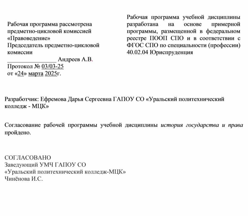 Рабочая программа рассмотрена предметно-цикловой комиссией «Правоведение» Председатель предметно-цикловой комиссии ________________ Андреев А.В. Протокол № 03/03-25 от «24» марта 2025г. |