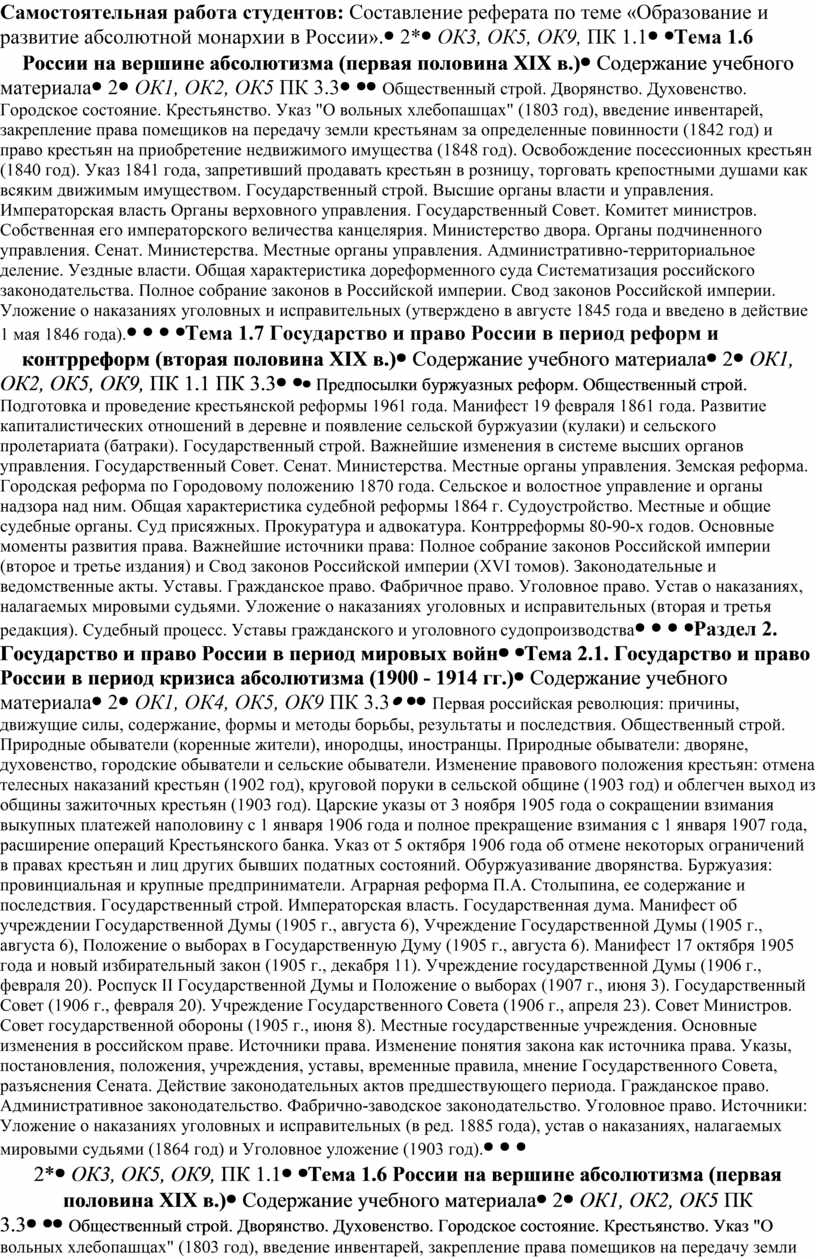 Разработка конспекта по теме «Государство и право России в период кризиса абсолютизма (1900 - 1914 гг.)» |