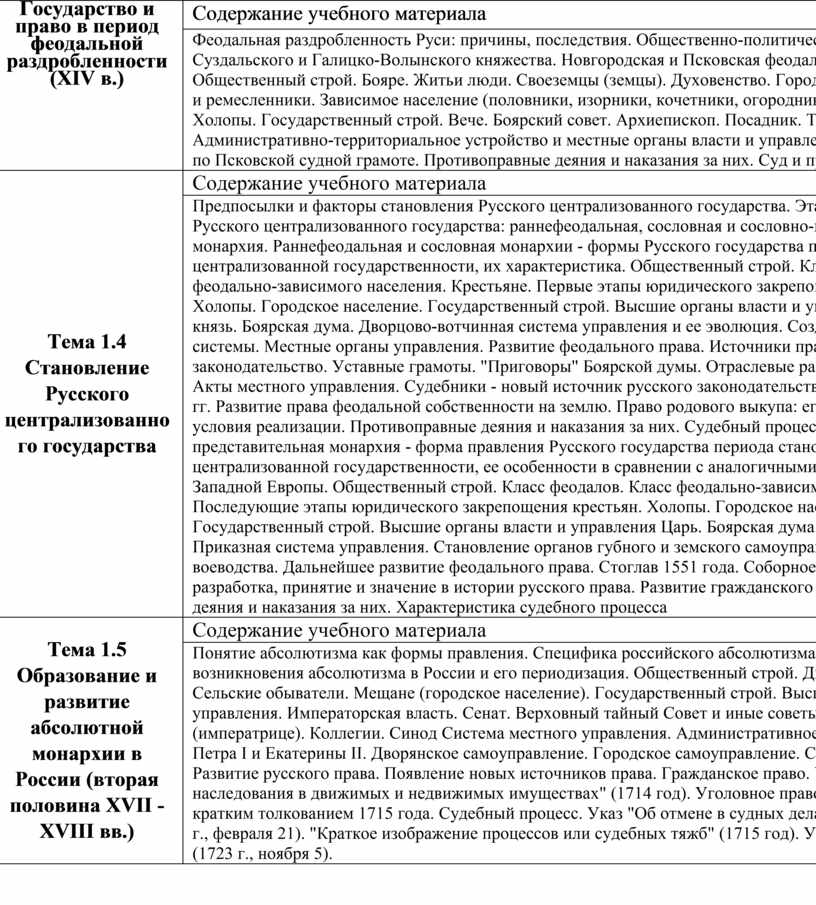 Феодальная раздробленность Руси: причины, последствия. Общественно-политический строй Ростово-Суздальского и Галицко-Волынского княжества. Новгородская и Псковская феодальные республики. Общественный строй. Бояре. Житьи люди. Своеземцы (земцы). Духовенство. Городское население - купцы и ремесленники. Зависимое население (половники, изорники, кочетники, огородники, закладники). Холопы. Государственный строй. Вече. Боярский совет. Архиепископ. Посадник. Тысяцкий. Князь. Административно-территориальное устройство и местные органы власти и управления. Гражданское право по Псковской судной грамоте. Противоправные деяния и наказания за них. Суд и процесс |