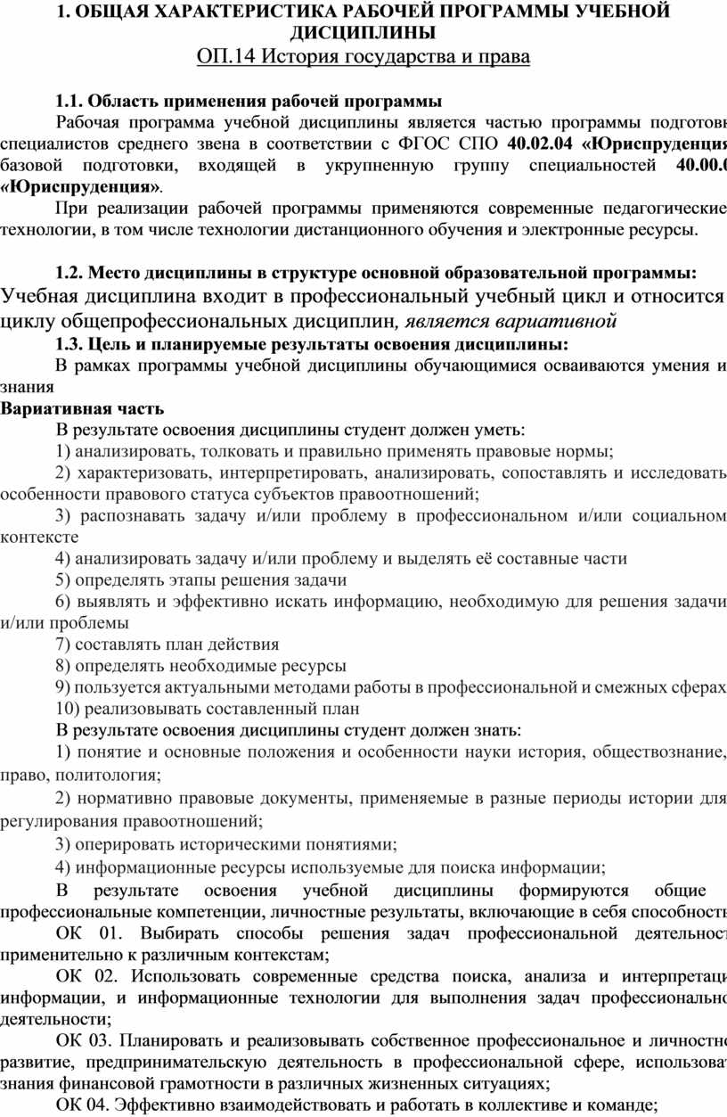 Рабочая программа учебной дисциплины разработана на основе примерной программы, размещенной в федеральном реестре ПООП СПО и в соответствии с ФГОС СПО по специальности (профессии) 40.02.04 Юриспруденция |