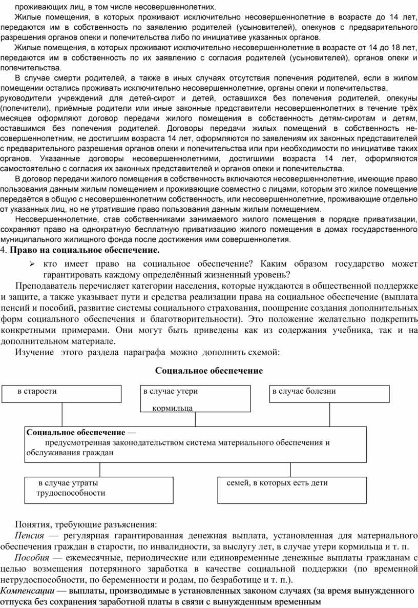 Преподаватель перечисляет категории населения, которые нуждаются в общественной поддержке и защите, а также указывает пути и средства реализации права на социальное обеспечение (выплата пенсий и пособий, развитие системы социального страхования, поощрение создания дополнительных форм социального обеспечения и благотворительности). Это положение желательно подкрепить конкретными примерами. Они могут быть приведены как из содержания учебника, так и на дополнительном материале.