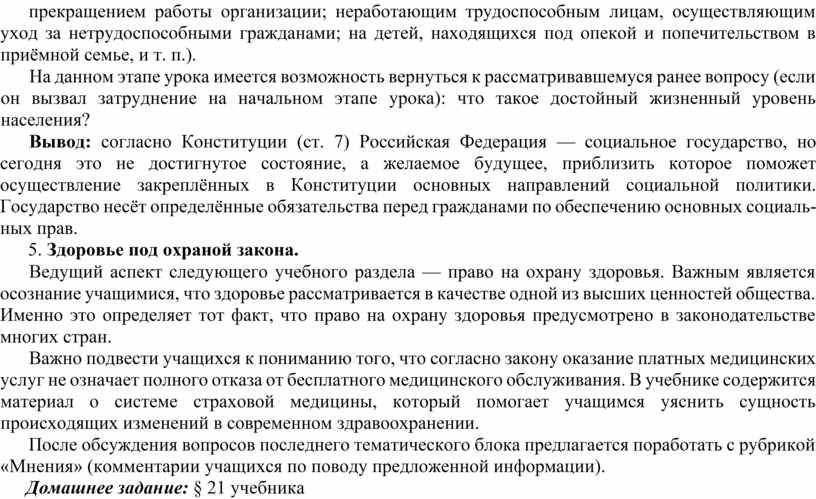 Важно подвести учащихся к пониманию того, что согласно закону оказание платных медицинских услуг не означает полного отказа от бесплатного медицинского обслуживания. В учебнике содержится материал о системе страховой медицины, который помогает учащимся уяснить сущность происходящих изменений в современном здравоохранении.