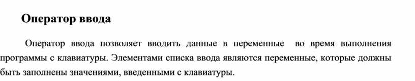 Оператор ввода позволяет вводить данные в переменные во время выполнения программы с клавиатуры. Элементами списка ввода являются переменные, которые должны быть заполнены значениями, введенными с клавиатуры.