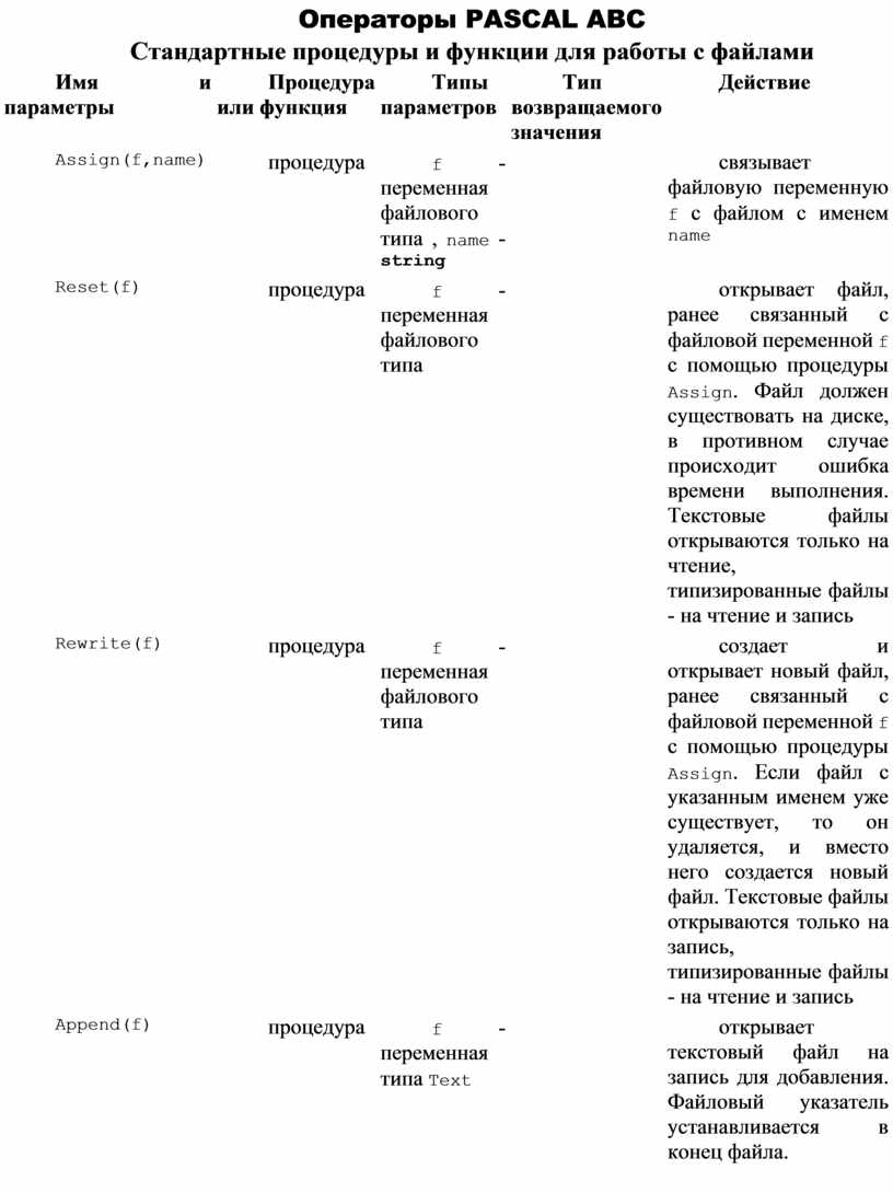 открывает файл, ранее связанный с файловой переменной f с помощью процедуры Assign. Файл должен существовать на диске, в противном случае происходит ошибка времени выполнения. Текстовые файлы открываются только на чтение, типизированные файлы - на чтение и запись |