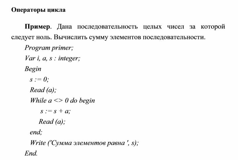 Пример. Дана последовательность целых чисел за которой следует ноль. Вычислить сумму элементов последовательности.
