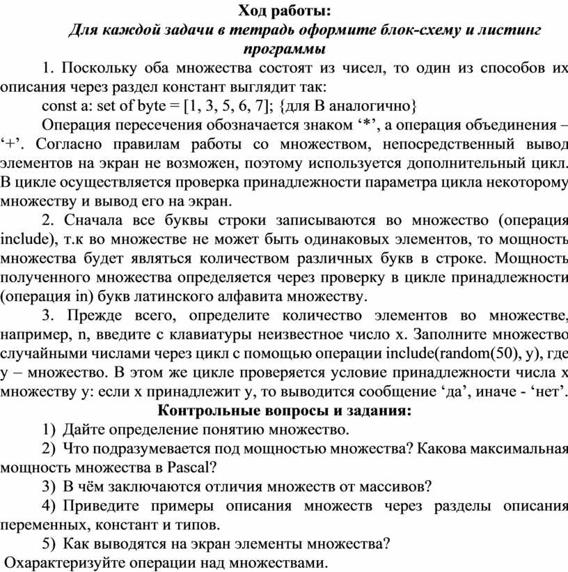 В Паскале под множеством понимают ограниченный, неупорядоченный набор различных элементов одинакового типа. Множество не может содержать одинаковых элементов. Всему множеству в целом дается имя, которое образуется также как и имена простых переменных и массивов. Для обозначения множества используются квадратные скобки, в которые заключаются элементы множества: [1,2,3], [‘a’,‘b’,‘c’]. Запись [] обозначает пустое множество. Пустое множество единственное, и принадлежит множествам всех типов.
