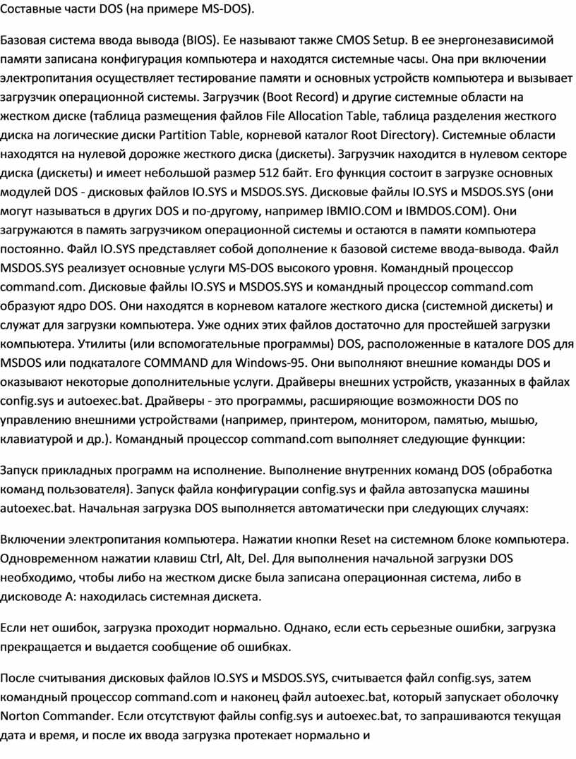 Базовая система ввода вывода (BIOS). Ее называют также CMOS Setup. В ее энергонезависимой памяти записана конфигурация компьютера и находятся системные часы. Она при включении электропитания осуществляет тестирование памяти и основных устройств компьютера и вызывает загрузчик операционной системы. Загрузчик (Boot Record) и другие системные области на жестком диске (таблица размещения файлов File Allocation Table, таблица разделения жесткого диска на логические диски Partition Table, корневой каталог Root Directory). Системные области находятся на нулевой дорожке жесткого диска (дискеты). Загрузчик находится в нулевом секторе диска (дискеты) и имеет небольшой размер 512 байт. Его функция состоит в загрузке основных модулей DOS - дисковых файлов IO.SYS и MSDOS.SYS. Дисковые файлы IO.SYS и MSDOS.SYS (они могут называться в других DOS и по-другому, например IBMIO.COM и IBMDOS.COM). Они загружаются в память загрузчиком операционной системы и остаются в памяти компьютера постоянно. Файл IO.SYS представляет собой дополнение к базовой системе ввода-вывода. Файл MSDOS.SYS реализует основные услуги MS-DOS высокого уровня. Командный процессор command.com. Дисковые файлы IO.SYS и MSDOS.SYS и командный процессор command.com образуют ядро DOS. Они находятся в корневом каталоге жесткого диска (системной дискеты) и служат для загрузки компьютера. Уже одних этих файлов достаточно для простейшей загрузки компьютера. Утилиты (или вспомогательные программы) DOS, расположенные в каталоге DOS для MSDOS или подкаталоге COMMAND для Windows-95. Они выполняют внешние команды DOS и оказывают некоторые дополнительные услуги. Драйверы внешних устройств, указанных в файлах config.sys и autoexec.bat. Драйверы - это программы, расширяющие возможности DOS по управлению внешними устройствами (например, принтером, монитором, памятью, мышью, клавиатурой и др.). Командный процессор command.com выполняет следующие функции: