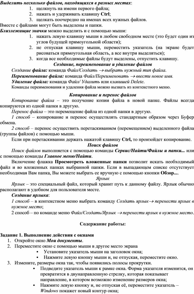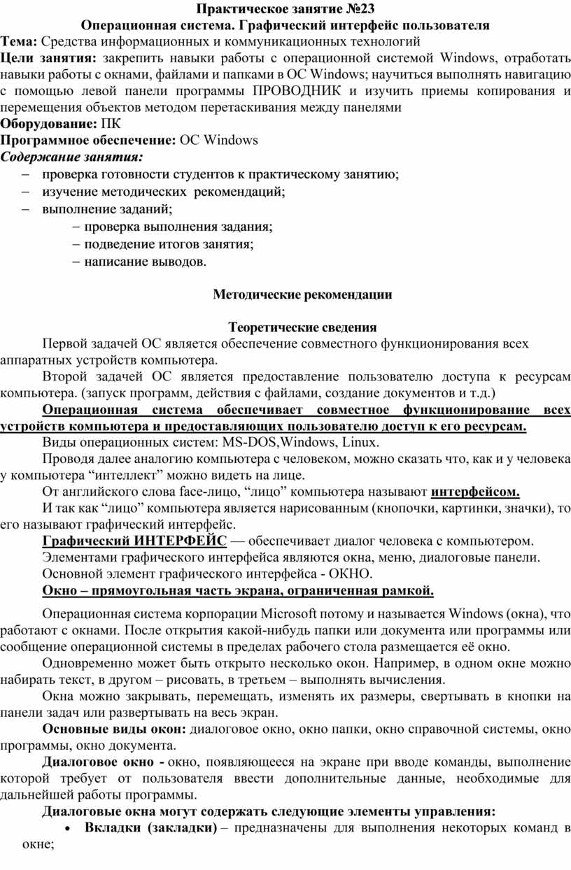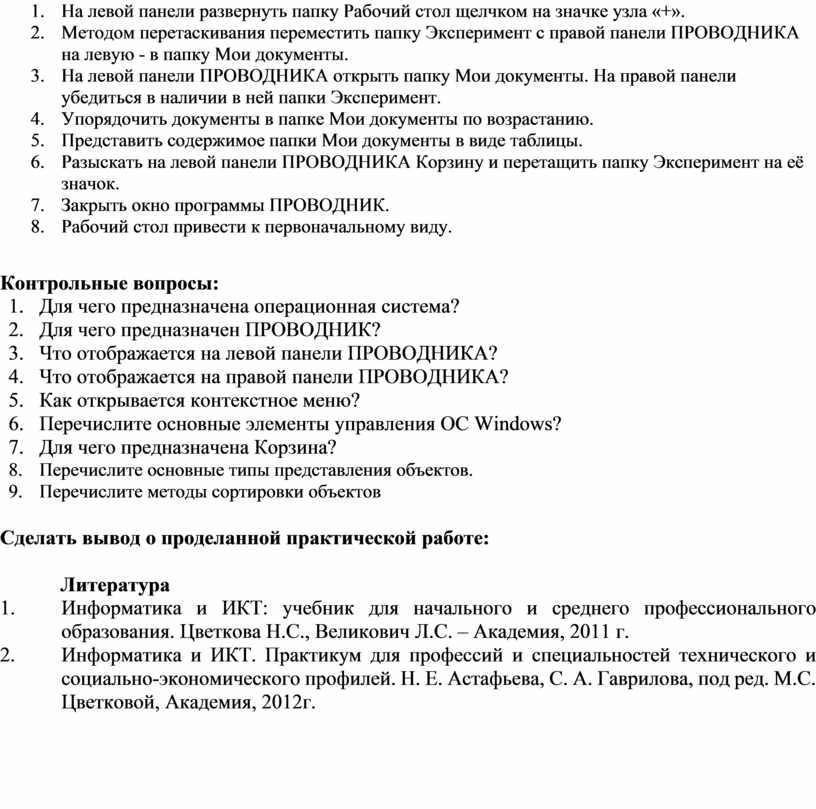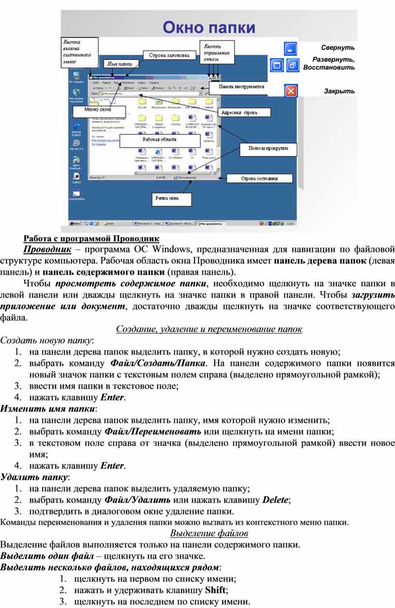 Цели занятия: закрепить навыки работы с операционной системой Windows, отработать навыки работы с окнами, файлами и папками в ОС Windows; научиться выполнять навигацию с помощью левой панели программы ПРОВОДНИК и изучить приемы копирования и перемещения объектов методом перетаскивания между панелями