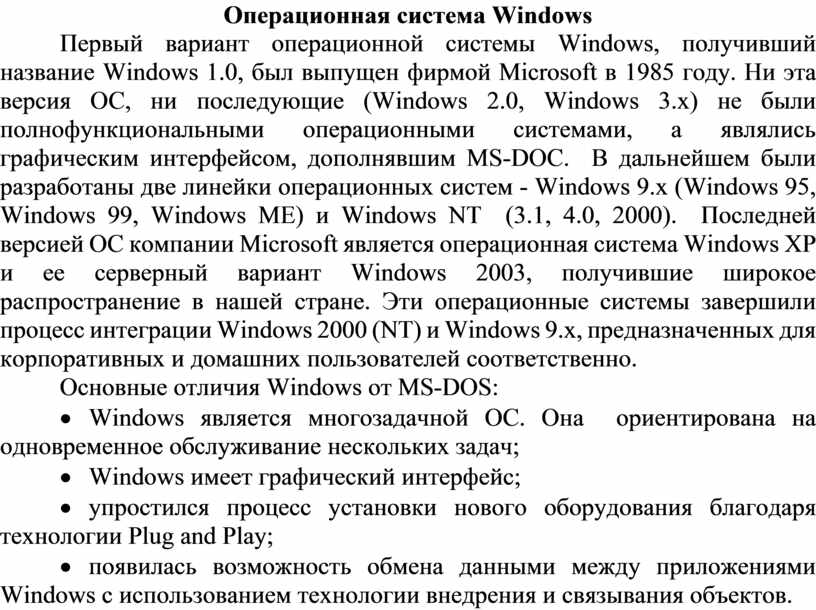 Первый вариант операционной системы Windows, получивший название Windows 1.0, был выпущен фирмой Microsoft в 1985 году. Ни эта версия ОС, ни последующие (Windows 2.0, Windows 3.x) не были полнофункциональными операционными системами, а являлись графическим интерфейсом, дополнявшим MS-DOC. В дальнейшем были разработаны две линейки операционных систем - Windows 9.x (Windows 95, Windows 99, Windows МЕ) и Windows NT (3.1, 4.0, 2000). Последней версией ОС компании Microsoft является операционная система Windows XP и ее серверный вариант Windows 2003, получившие широкое распространение в нашей стране. Эти операционные системы завершили процесс интеграции Windows 2000 (NT) и Windows 9.x, предназначенных для корпоративных и домашних пользователей соответственно.