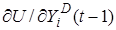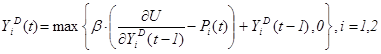 3. Споживач пред‘являє попит на i–й продукт таким чином. Якщо на i–й продукт попиту немає, або якщо гранична корисність споживання менше граничних затрат, то споживач залишає розмір попиту без змін. Інакше він коректує попит пропорційно різниці між граничною корисністю та граничними затратами та в результаті надає аукціоністу відповідну величину YiD(t) .