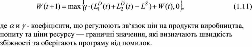 де a и g - коефіцієнти, що регулюють зв‘язок цін на продукти виробництва, попиту та ціни ресурсу –– граничні значення, які визначають швидкість збіжності та оберігають програму від помилок.