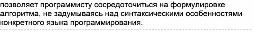 Для записи алгоритмов использовался естественный язык. Иногда используют полуформальный язык с ограниченным словарём (часто на основе английского языка), промежуточный между естественным языком и языком программирования. Такой язык называетсяпсевдокодом. Запись алгоритма на псевдокоде называетсяструктурным планом. Псевдокод удобен тем, что позволяет программисту сосредоточиться на формулировке алгоритма, не задумываясь над синтаксическими особенностями конкретного языка программирования.