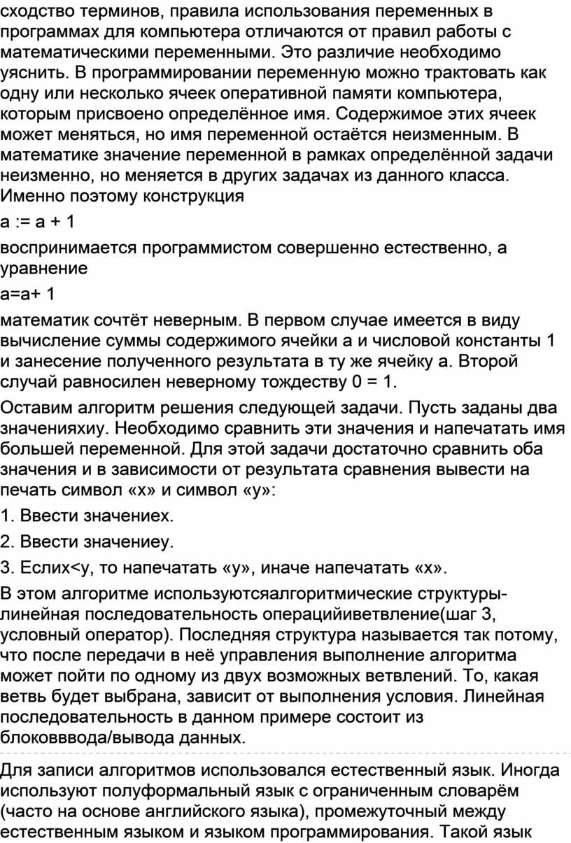 Оставим алгоритм решения следующей задачи. Пусть заданы два значенияxиy. Необходимо сравнить эти значения и напечатать имя большей переменной. Для этой задачи достаточно сравнить оба значения и в зависимости от результата сравнения вывести на печать символ «х» и символ «у»: