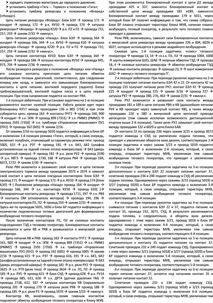 Включившись, реле РММ1 (РММ2) подготавливает цепь питания для движения тепловоза между проводами 899 (7351) и 2591 (7350), а также запитывает задатчик позиций по цепи: зажим 1/31 à провода 2757, 428 à з.к. РММ1 (РММ2) à провод 4001 (4002) à БЭЛ.