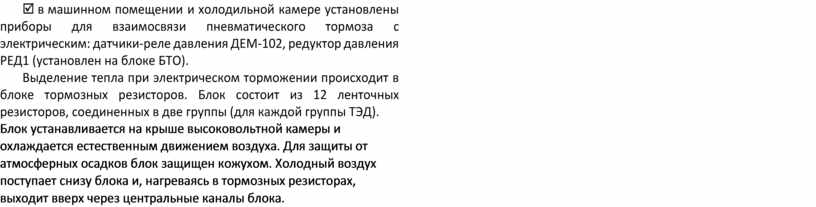 Выделение тепла при электрическом торможении происходит в блоке тормозных резисторов. Блок состоит из 12 ленточных резисторов, соединенных в две группы (для каждой группы ТЭД).