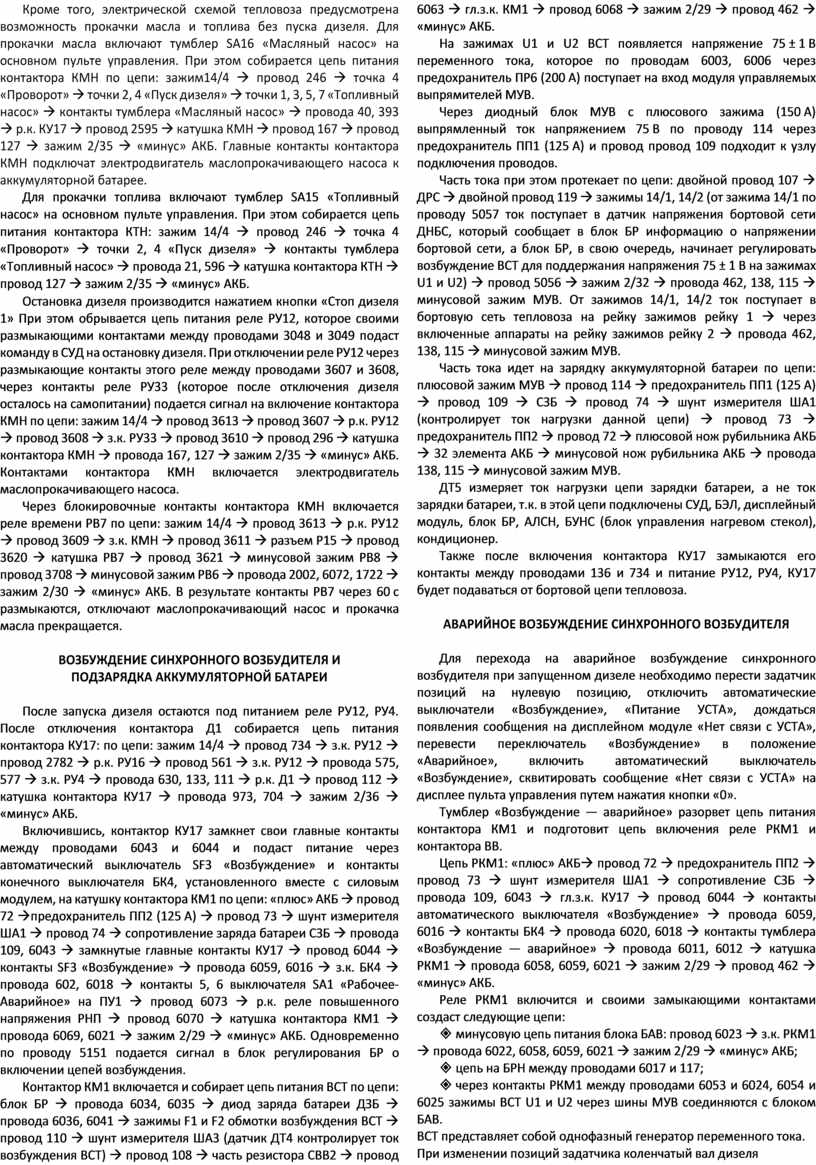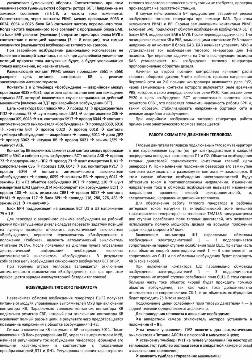 Цепь контактора ВВ: «плюс» АКБ à провод 72 à предохранитель ПП2 à провод 73 à шунт измерителя ША1 à сопротивление СЗБ à провода109, 6043 à з.к. контактора КУ17 à провод 6044 à контакты автоматического выключателя «Возбуждение» à провода6059, 6016 à контакты БК4 à провод 6020 à провод 6018 à контакты тумблера «Возбуждение — аварийное» à провод 6011 à диод ДР2 à провод 6062 à катушка ВВ à провод 6021 à зажим 2/29 à «минус» АКБ.
