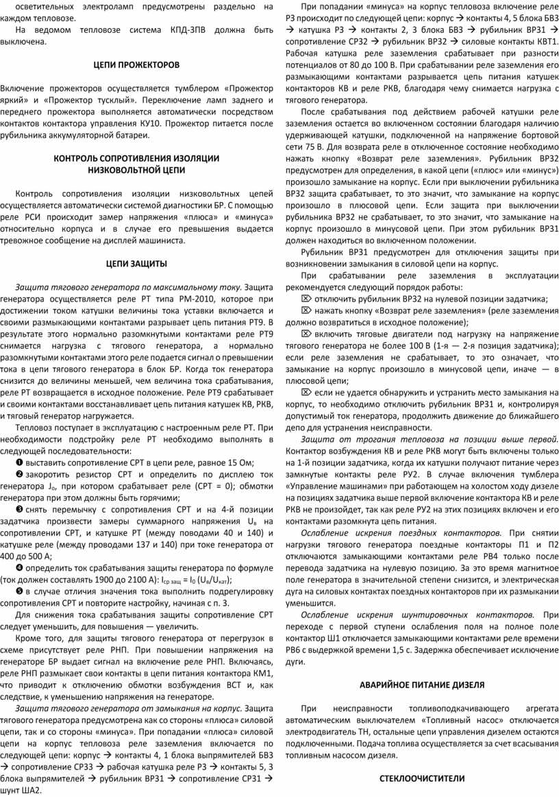 Защита тягового генератора по максимальному току. Защита генератора осуществляется реле РТ типа РМ-2010, которое при достижении током катушки величины тока уставки включается и своими размыкающими контактами разрывает цепь питания РТ9. В результате этого нормально разомкнутыми контактами реле РТ9 снимается нагрузка с тягового генератора, а нормально разомкнутыми контактами этого реле подается сигнал о превышении тока в цепи тягового генератора в блок БР. Когда ток генератора снизится до величины меньшей, чем величина тока срабатывания, реле РТ возвращается в исходное положение. Реле РТ9 срабатывает и своими контактами восстанавливает цепь питания катушек КВ, РКВ, и тяговый генератор нагружается.