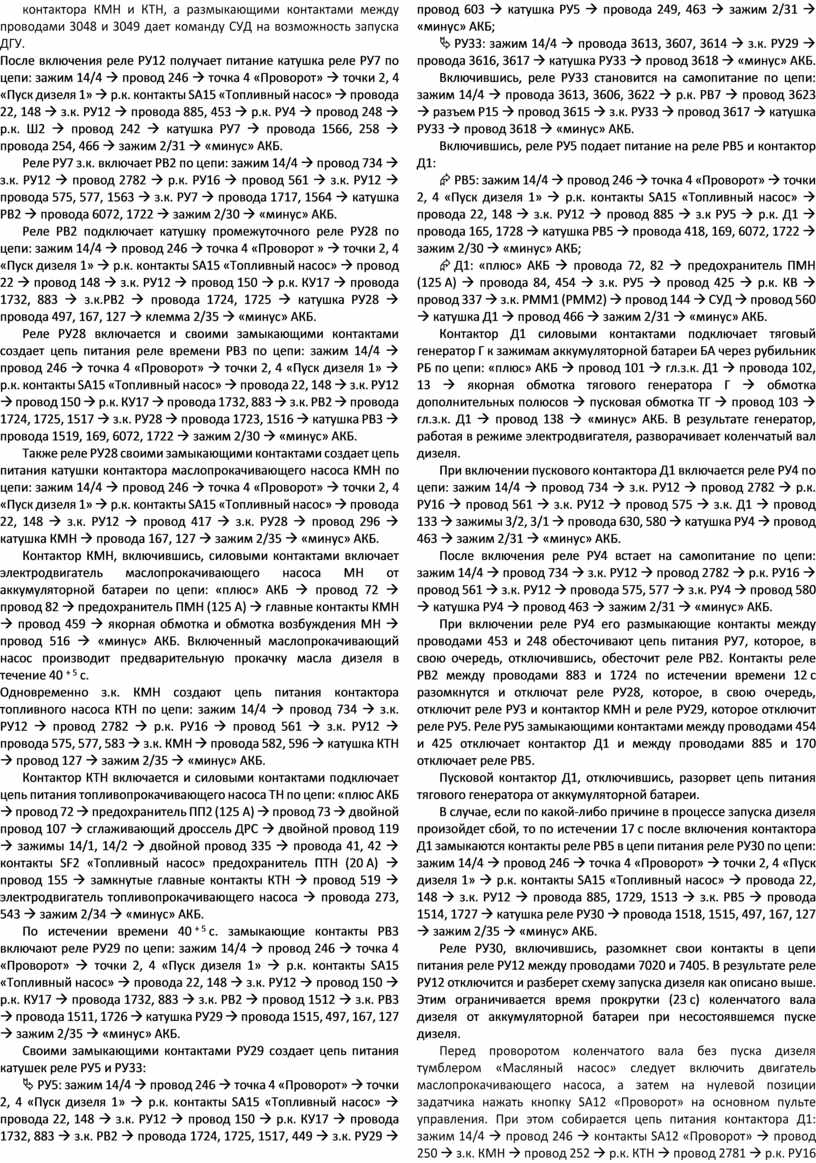 Одновременно замыкающими контактами реле РУ12 подготавливается цепь питания реле РВ3, РВ5, РУ5, РУ28, РУ29, РУ30, а также контактора КМН и КТН, а размыкающими контактами между проводами 3048 и 3049 дает команду СУД на возможность запуска ДГУ.