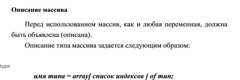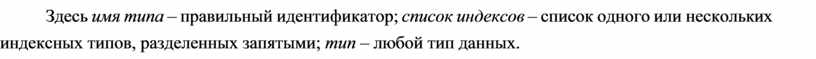 Здесь имя типа – правильный идентификатор; список индексов – список одного или нескольких индексных типов, разделенных запятыми; тип – любой тип данных.