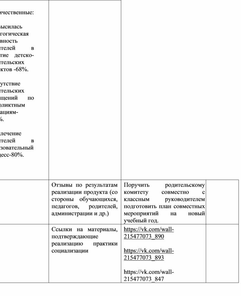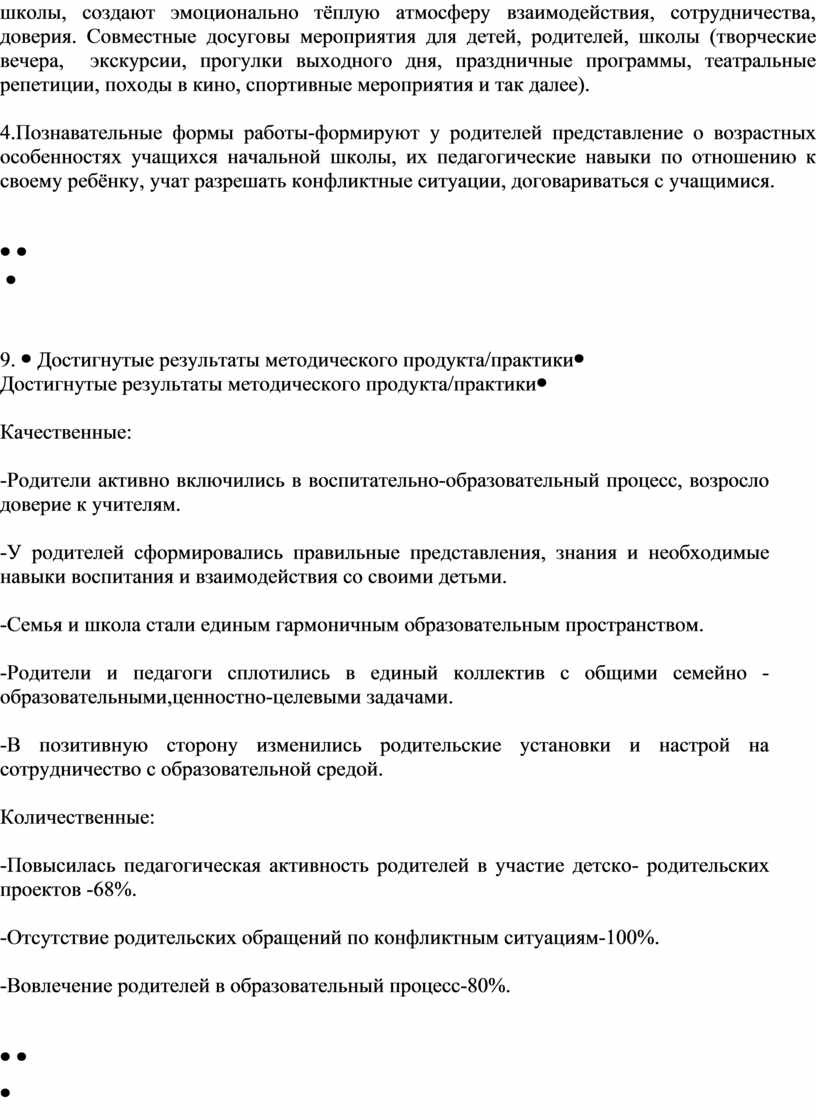 Вовлечение родителей в образовательный процесс; повышение активности участия семей в мероприятиях, конкурсах различного уровня; родители стали организаторами многих проводимых в школе акций, мероприятий.