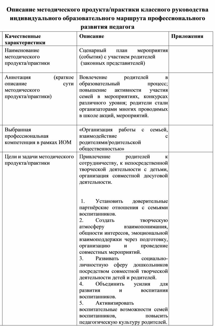 Описание методического продукта/практики классного руководства индивидуального образовательного маршрута профессионального развития педагога