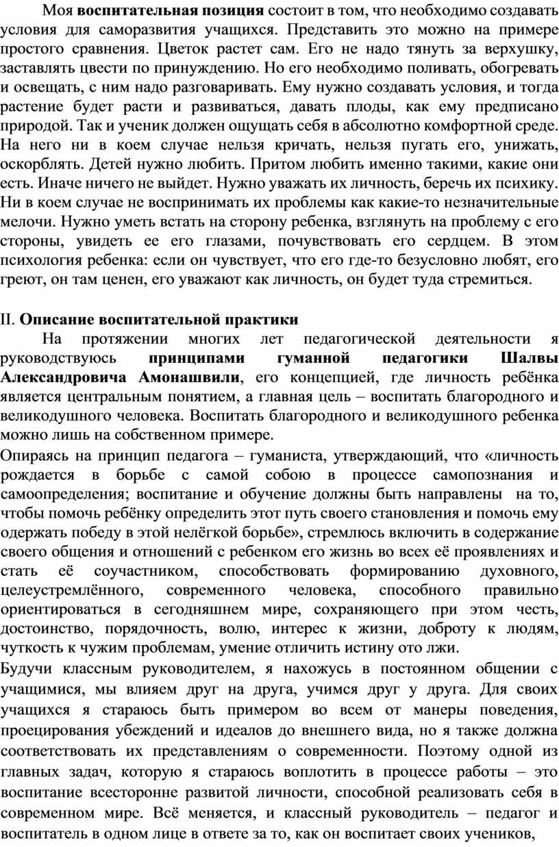 На протяжении многих лет педагогической деятельности я руководствуюсь принципами гуманной педагогики Шалвы Александровича Амонашвили, его концепцией, где личность ребёнка является центральным понятием, а главная цель – воспитать благородного и великодушного человека. Воспитать благородного и великодушного ребенка можно лишь на собственном примере.