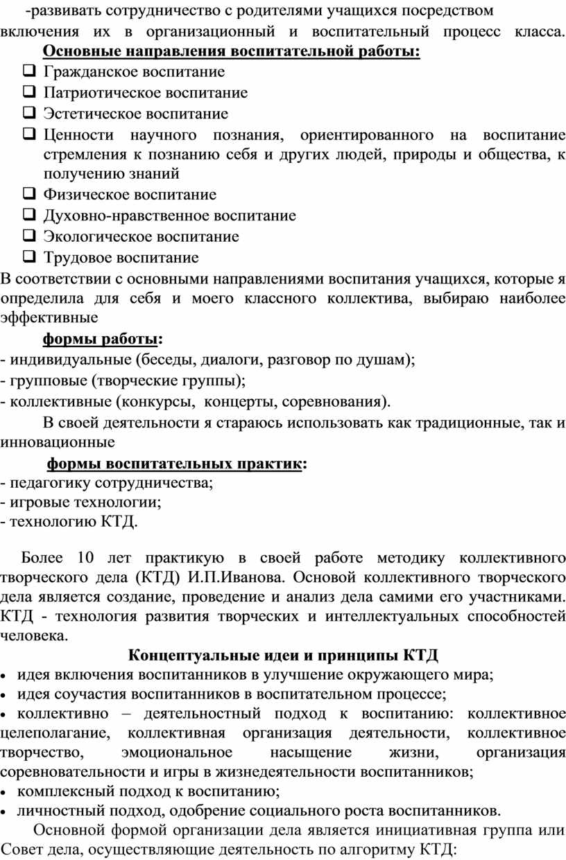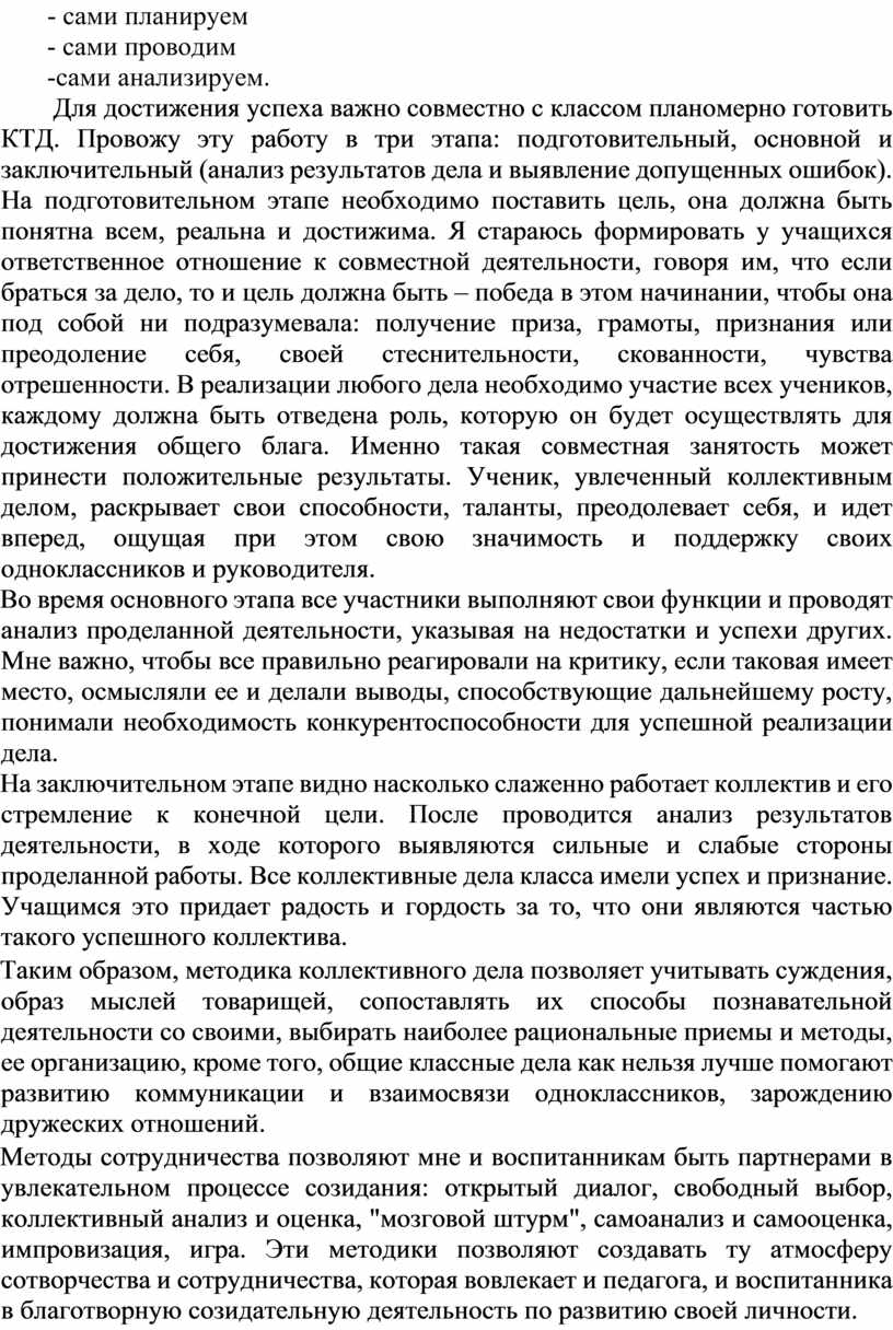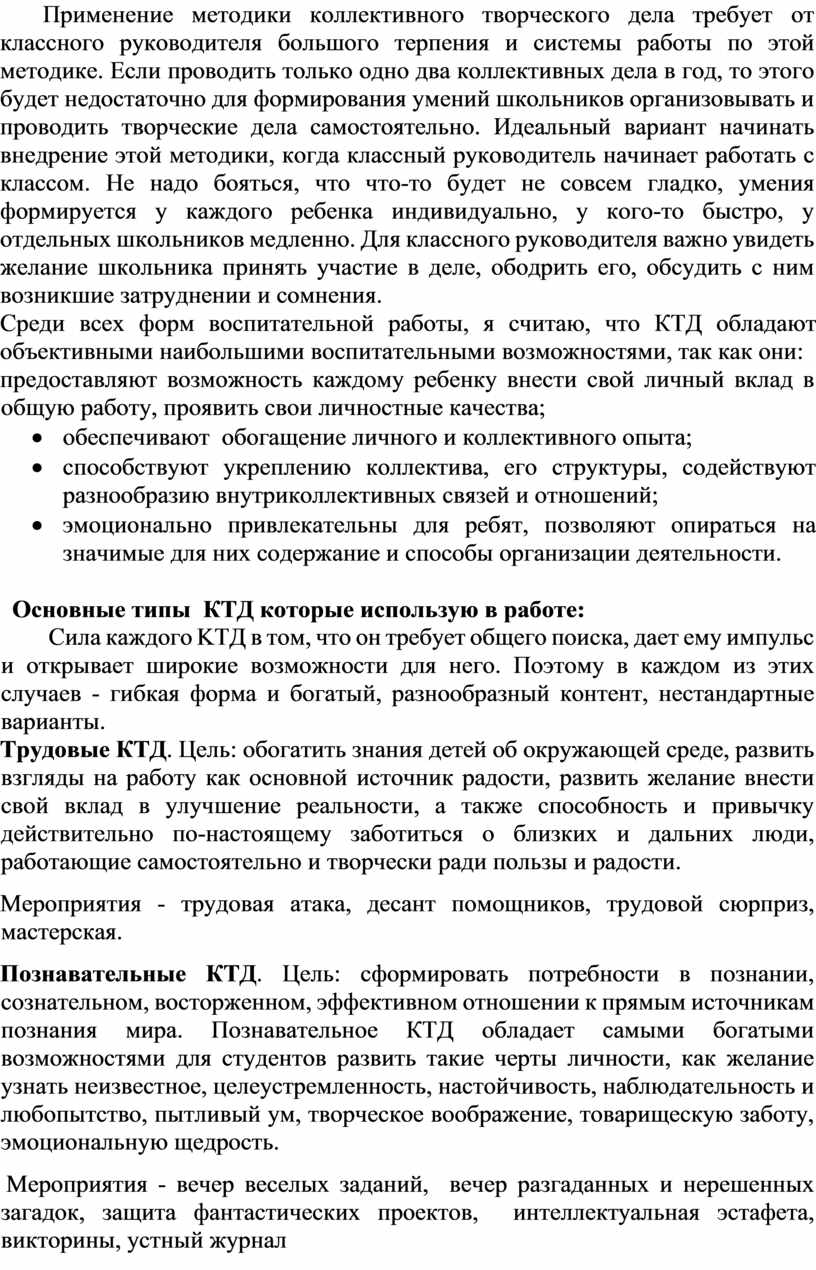 Более 10 лет практикую в своей работе методику коллективного творческого дела (КТД) И.П.Иванова. Основой коллективного творческого дела является создание, проведение и анализ дела самими его участниками. КТД - технология развития творческих и интеллектуальных способностей человека.