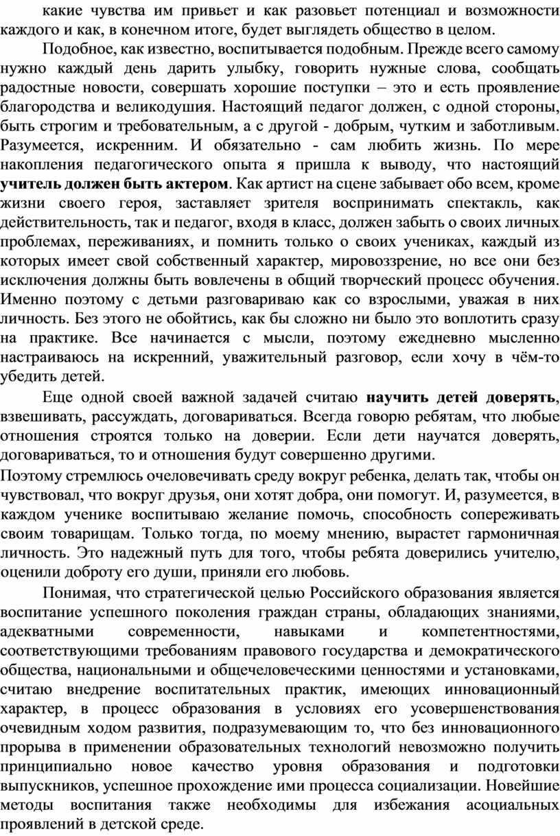 Опираясь на принцип педагога – гуманиста, утверждающий, что «личность рождается в борьбе с самой собою в процессе самопознания и самоопределения; воспитание и обучение должны быть направлены на то, чтобы помочь ребёнку определить этот путь своего становления и помочь ему одержать победу в этой нелёгкой борьбе», стремлюсь включить в содержание своего общения и отношений с ребенком его жизнь во всех её проявлениях и стать её соучастником, способствовать формированию духовного, целеустремлённого, современного человека, способного правильно ориентироваться в сегодняшнем мире, сохраняющего при этом честь, достоинство, порядочность, волю, интерес к жизни, доброту к людям, чуткость к чужим проблемам, умение отличить истину ото лжи.