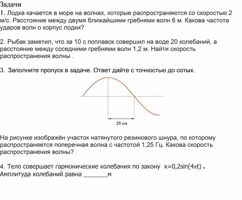1. Лодка качается в море на волнах, которые распространяются со скоростью 2 м/с. Расстояние между двумя ближайшими гребнями волн 6 м. Какова частота ударов волн о корпус лодки?