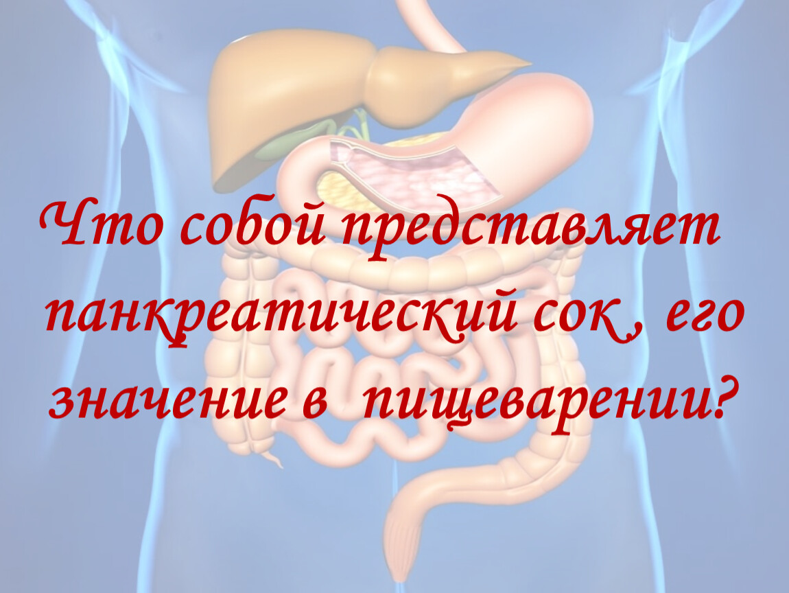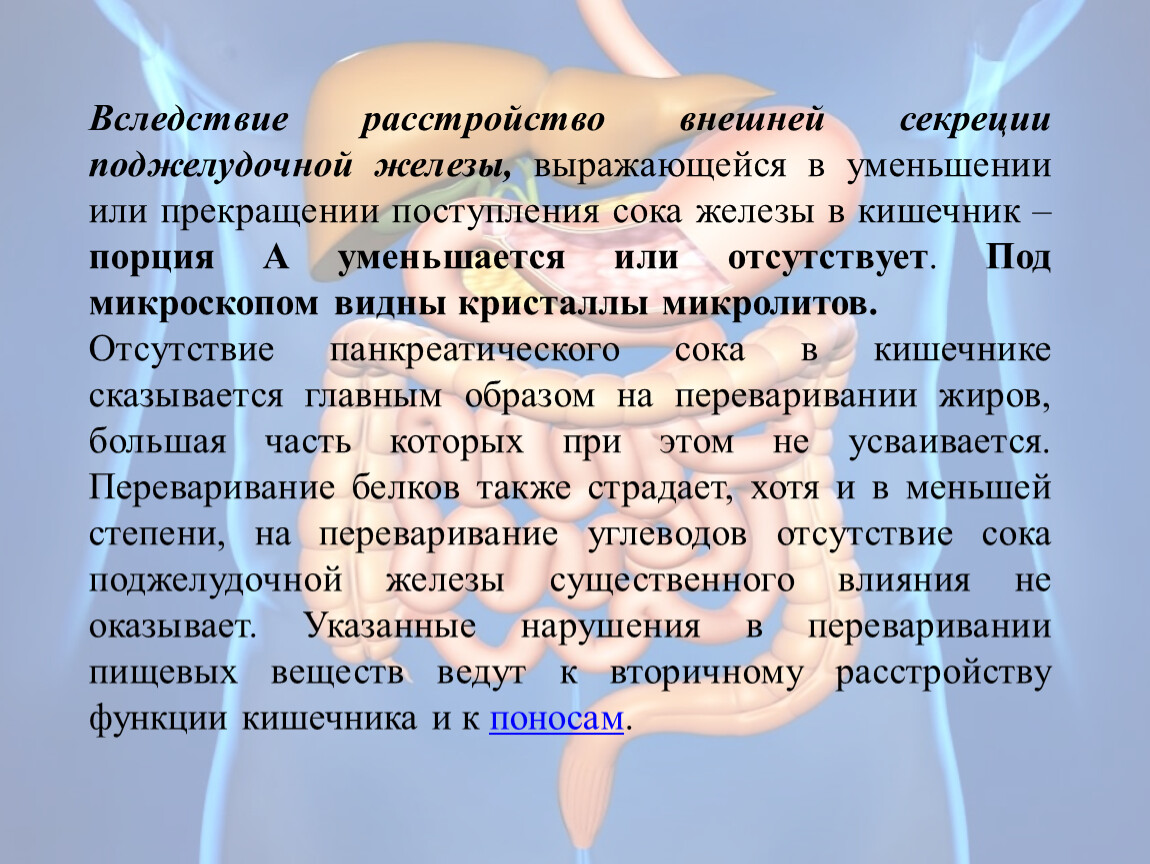 Значение сока поджелудочной железы в том, что под его влиянием гидролизуются белки и жиры. Если перевязать проток железы, то будет усваиваться лишь 40% жиров и 50% белков (до перевязки усваивалось соответственно 94 и 92%).