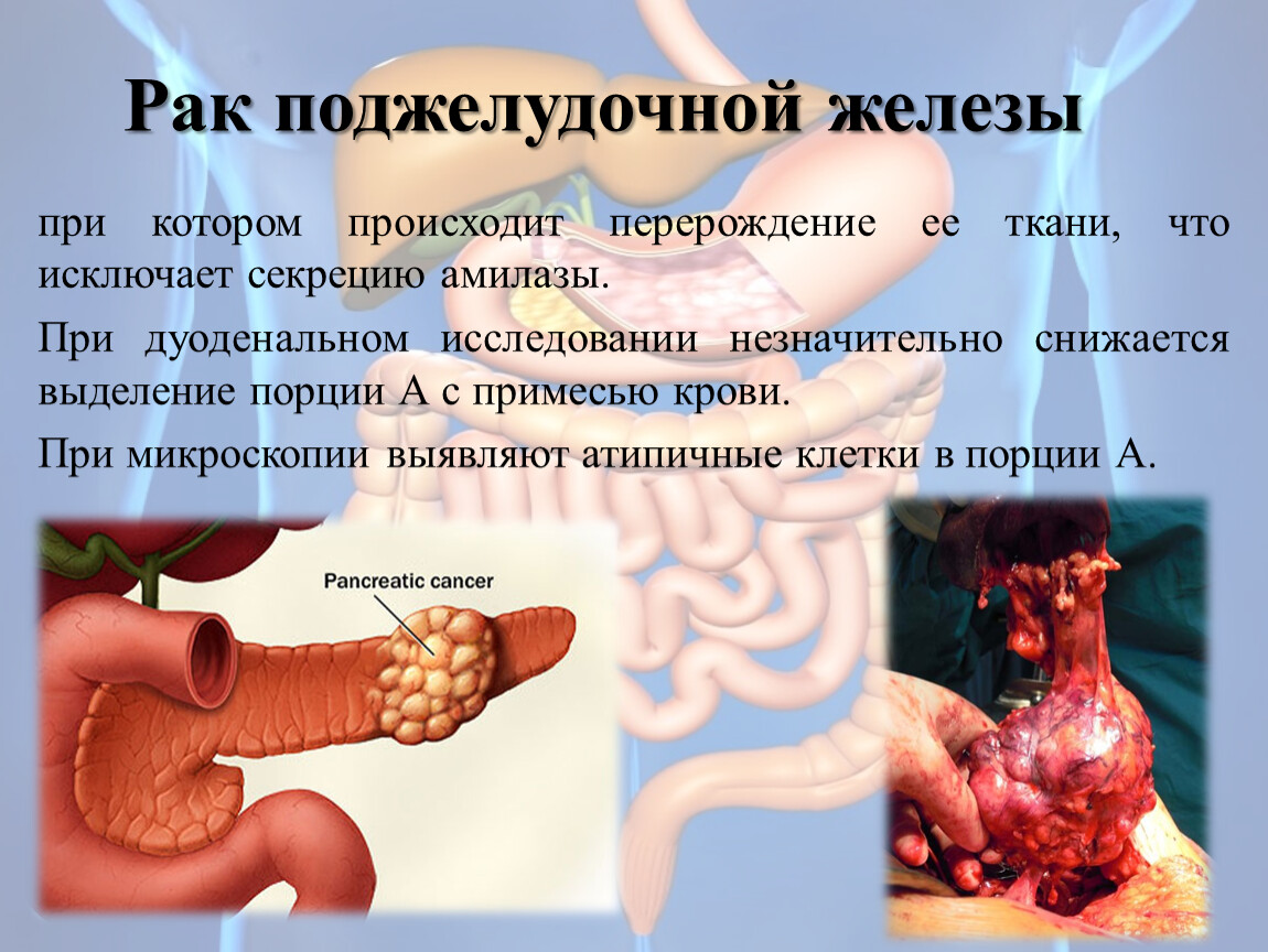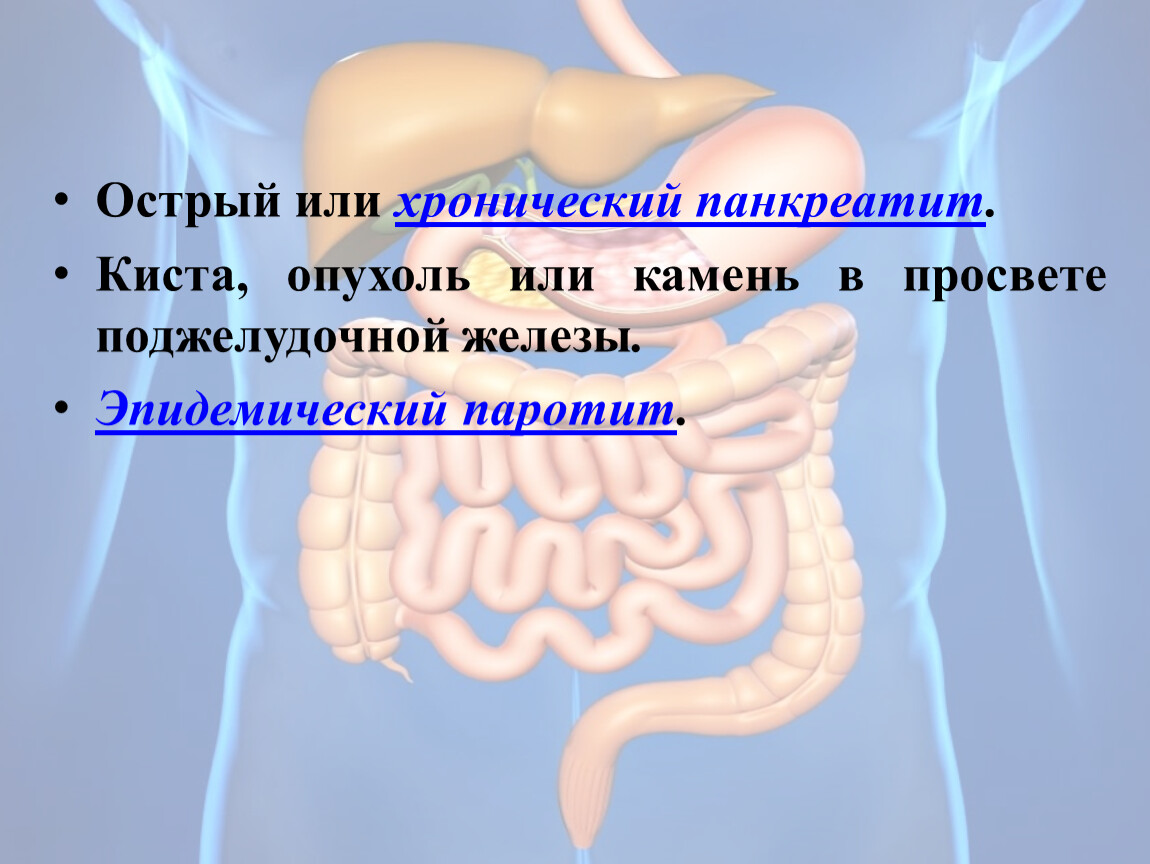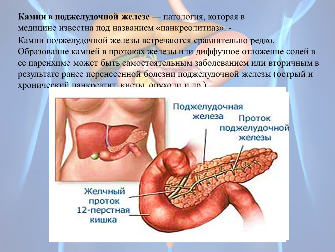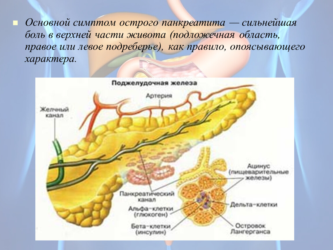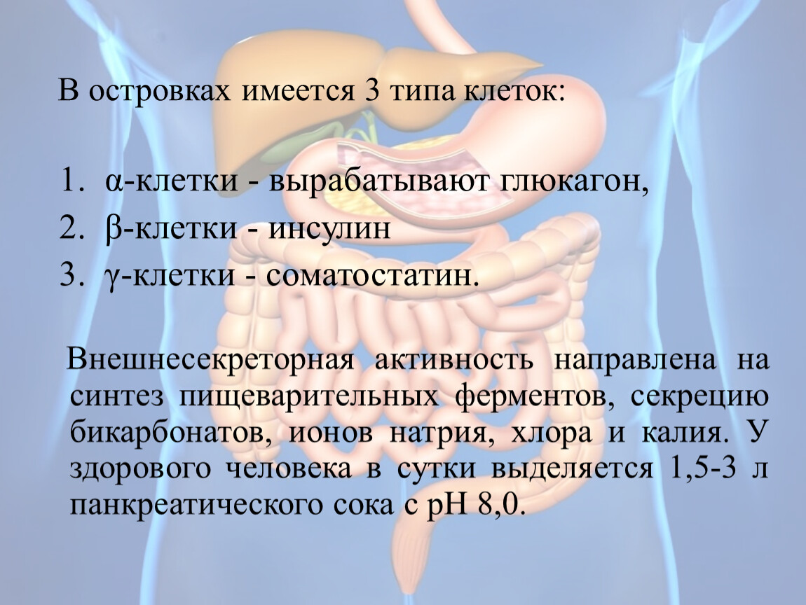 Поджелудочная железа расположена в брюшной полости позади желудка, состоит из головки, тела и хвоста, выполняет внешне- и внутрисекреторную функции. Примерно 90% клеток железы - ацинарные клетки, 10% - островковые клетки (клетки Лангерганса).