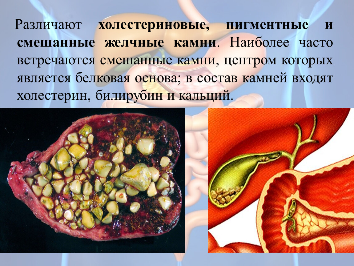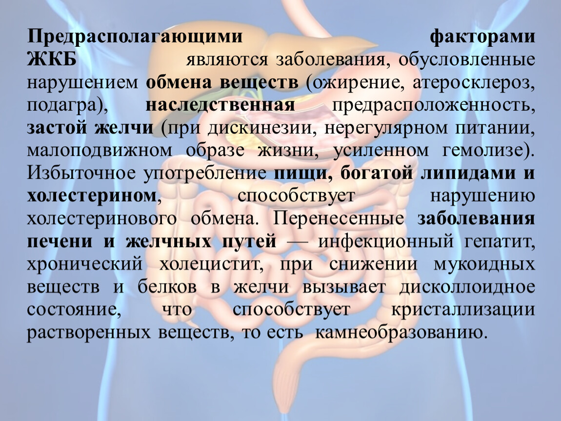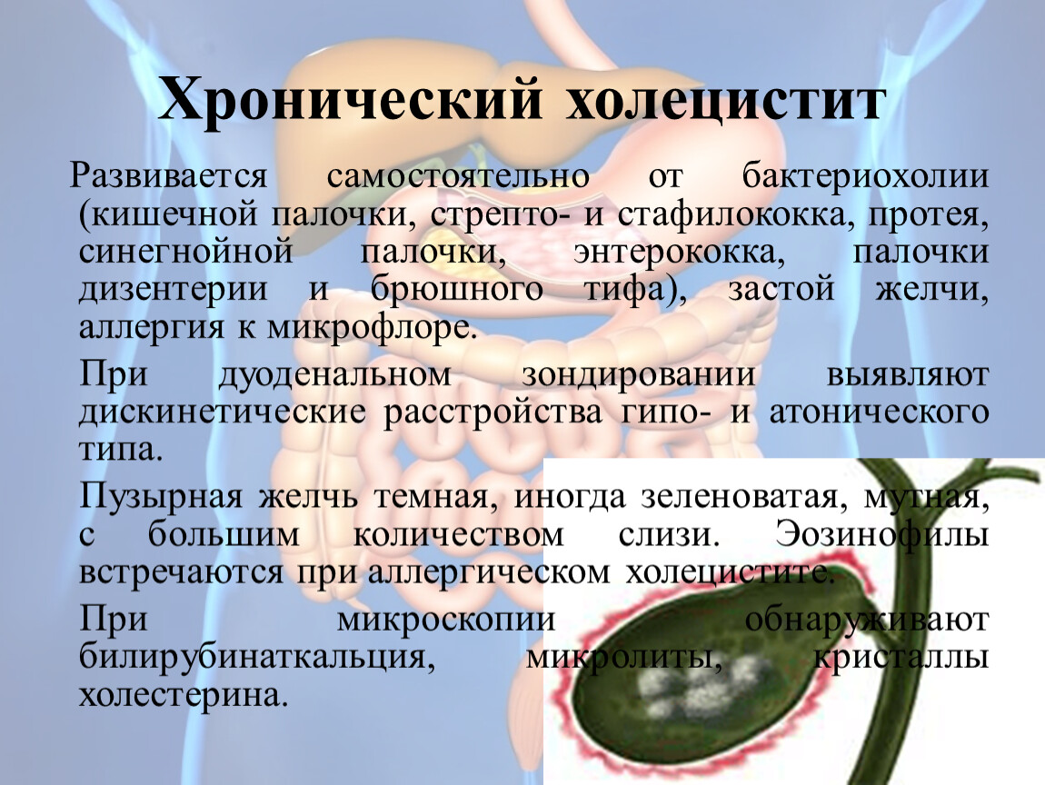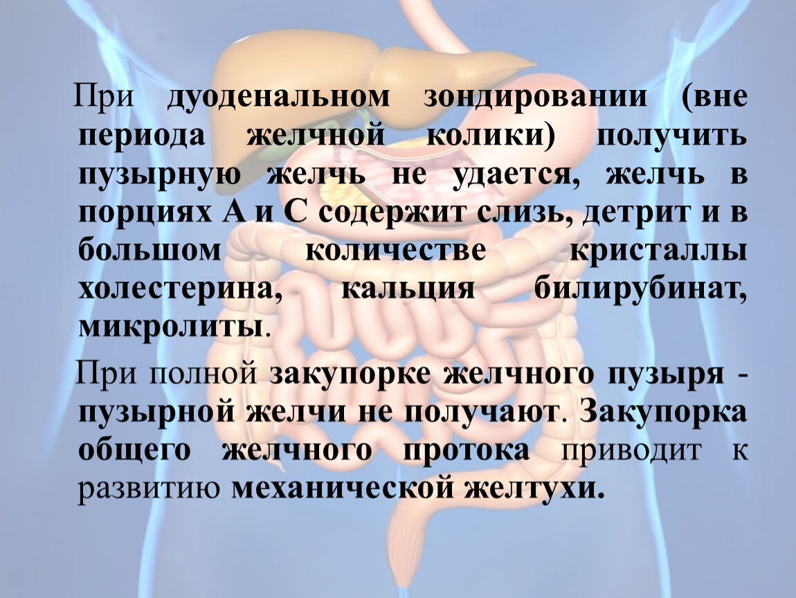 Желчь связывает пепсин, эмульгирует жиры, активизирует липазу, подавляет развитие патогенных микробов и стимулирует рост полезной микрофлоры. При снижении мукоидных веществ и белков в ЖП возникает дисколлоидное состояние, когда кристал- лизируются растворимые вещества –т.е камнеобразованию