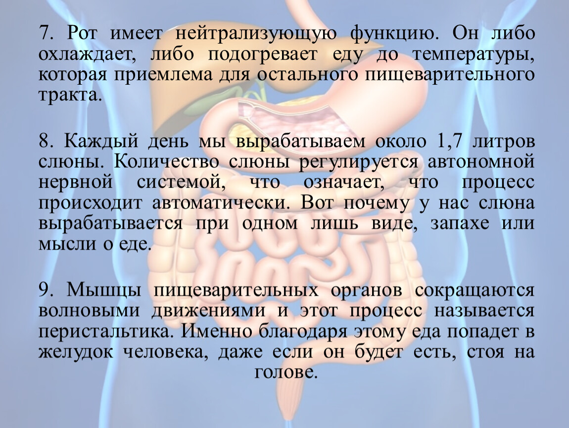 9. Мышцы пищеварительных органов сокращаются волновыми движениями и этот процесс называется перистальтика. Именно благодаря этому еда попадет в желудок человека, даже если он будет есть, стоя на голове.