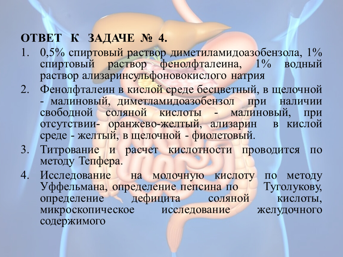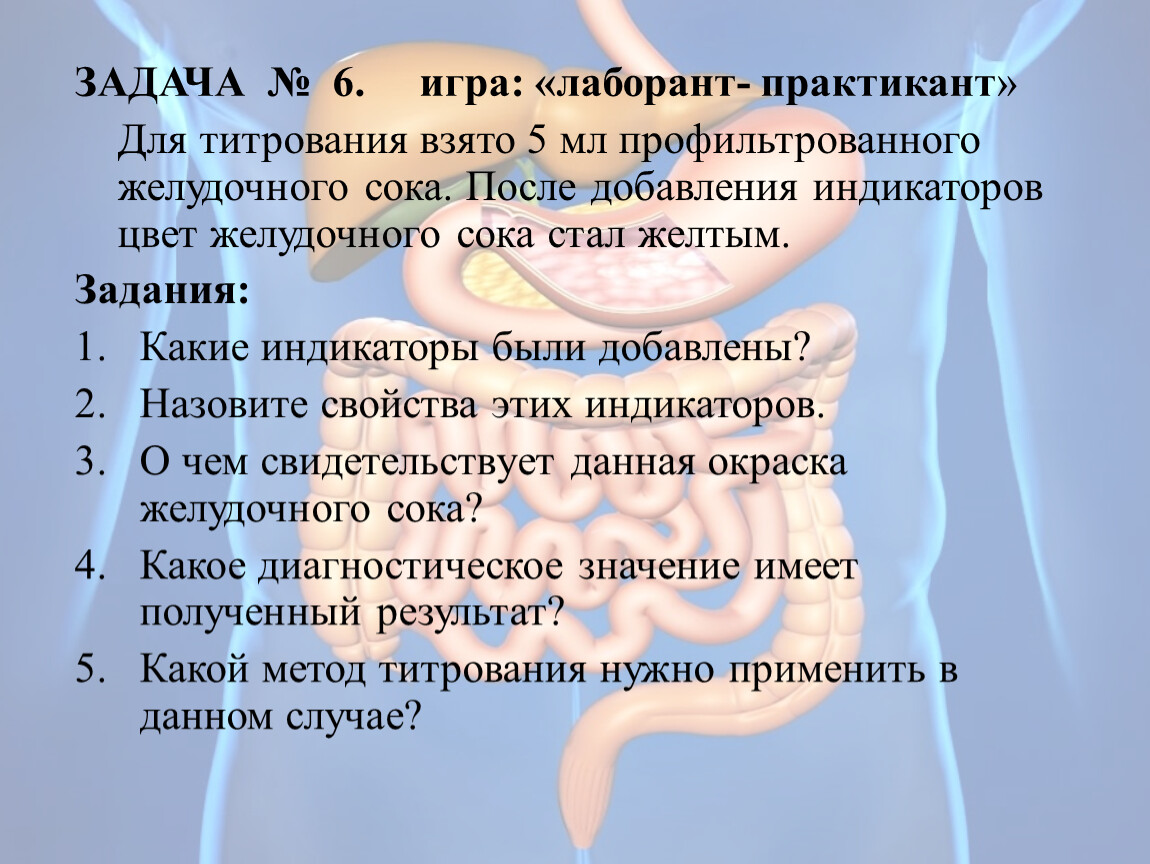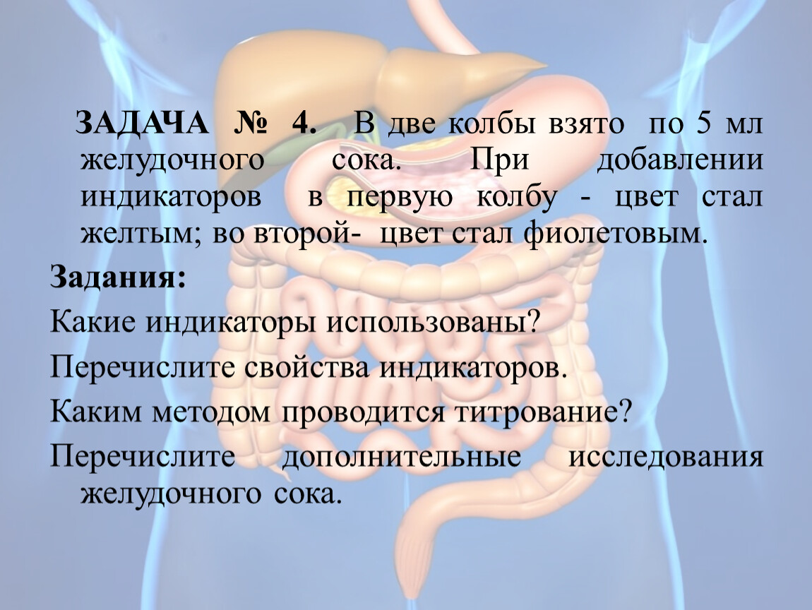 ЗАДАЧА № 4. В две колбы взято по 5 мл желудочного сока. При добавлении индикаторов в первую колбу - цвет стал желтым; во второй- цвет стал фиолетовым.