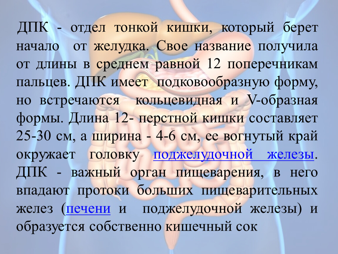 ДПК - отдел тонкой кишки, который берет начало от желудка. Свое название получила от длины в среднем равной 12 поперечникам пальцев. ДПК имеет подковообразную форму, но встречаются кольцевидная и V-образная формы. Длина 12- перстной кишки составляет 25-30 см, а ширина - 4-6 см, ее вогнутый край окружает головку поджелудочной железы. ДПК - важный орган пищеварения, в него впадают протоки больших пищеварительных желез (печени и поджелудочной железы) и образуется собственно кишечный сок