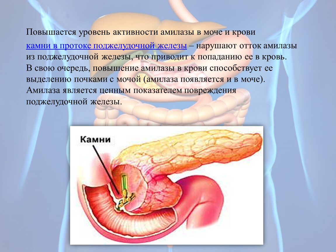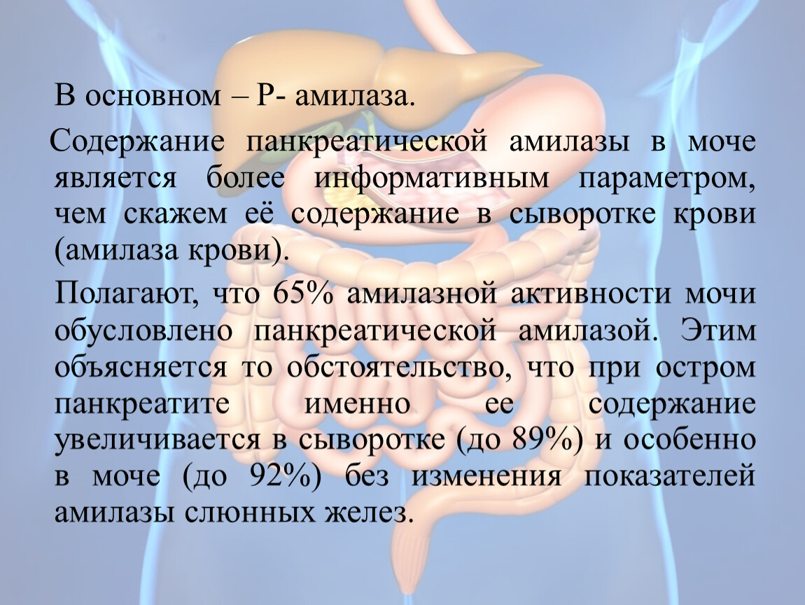 Полагают, что 65% амилазной активности мочи обусловлено панкреатической амилазой. Этим объясняется то обстоятельство, что при остром панкреатите именно ее содержание увеличивается в сыворотке (до 89%) и особенно в моче (до 92%) без изменения показателей амилазы слюнных желез.