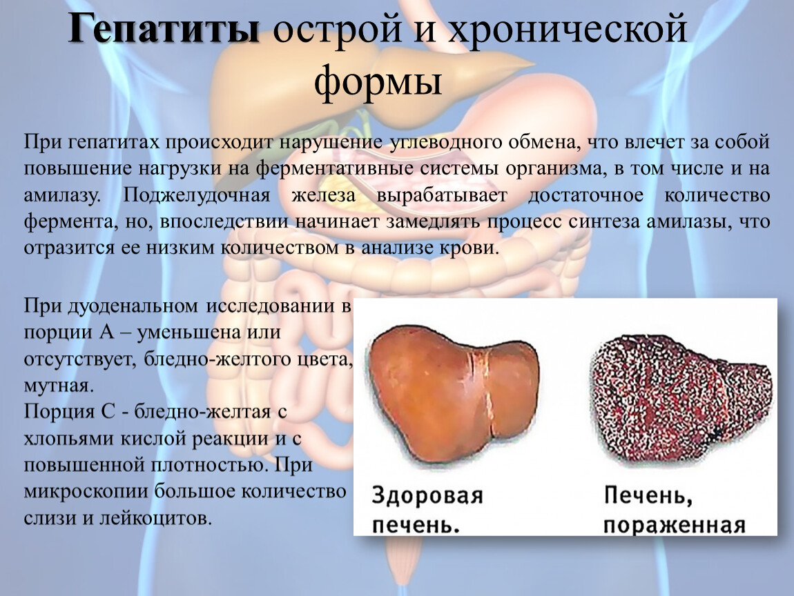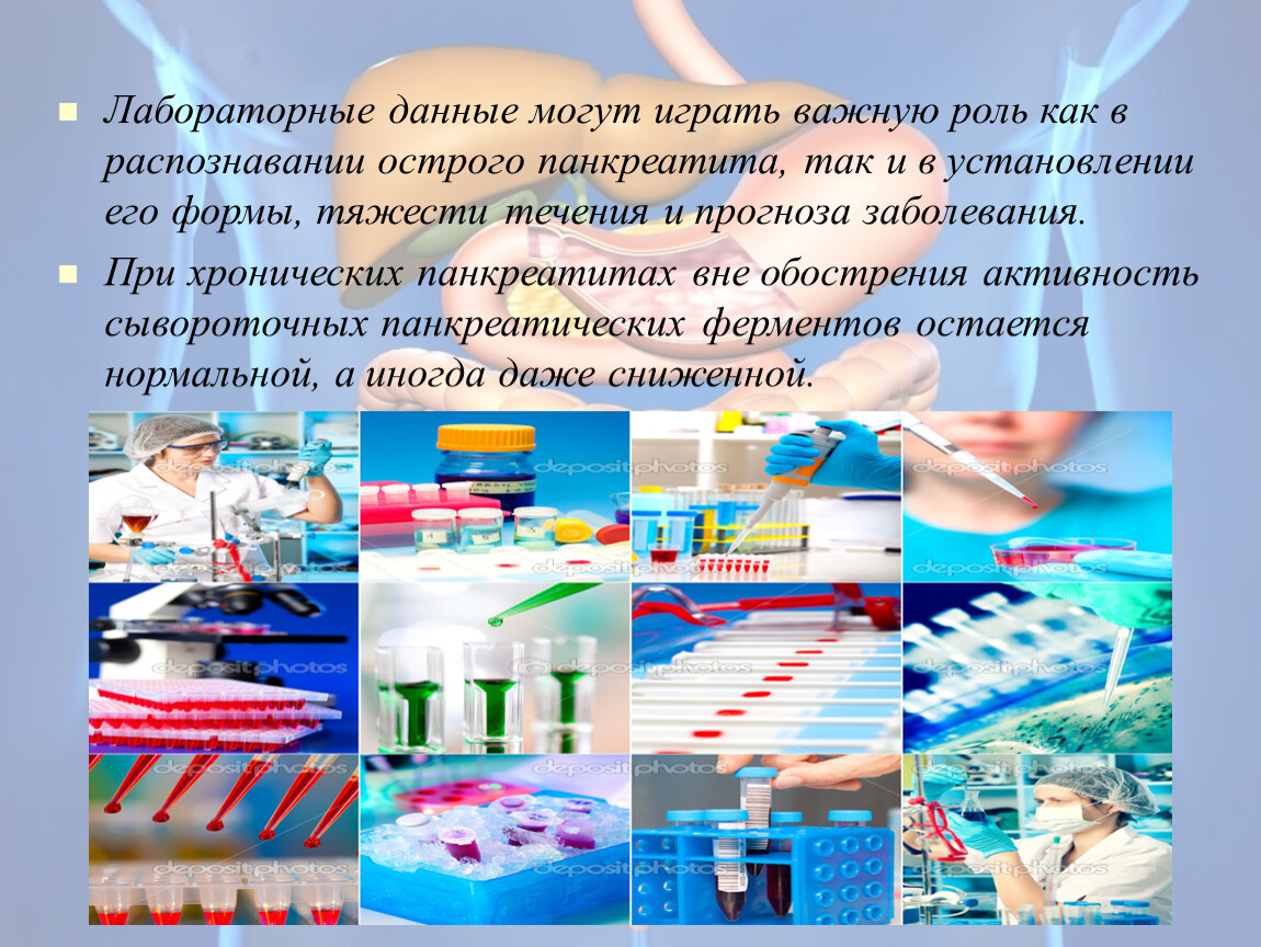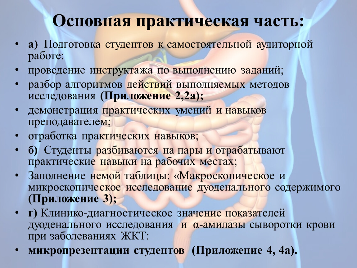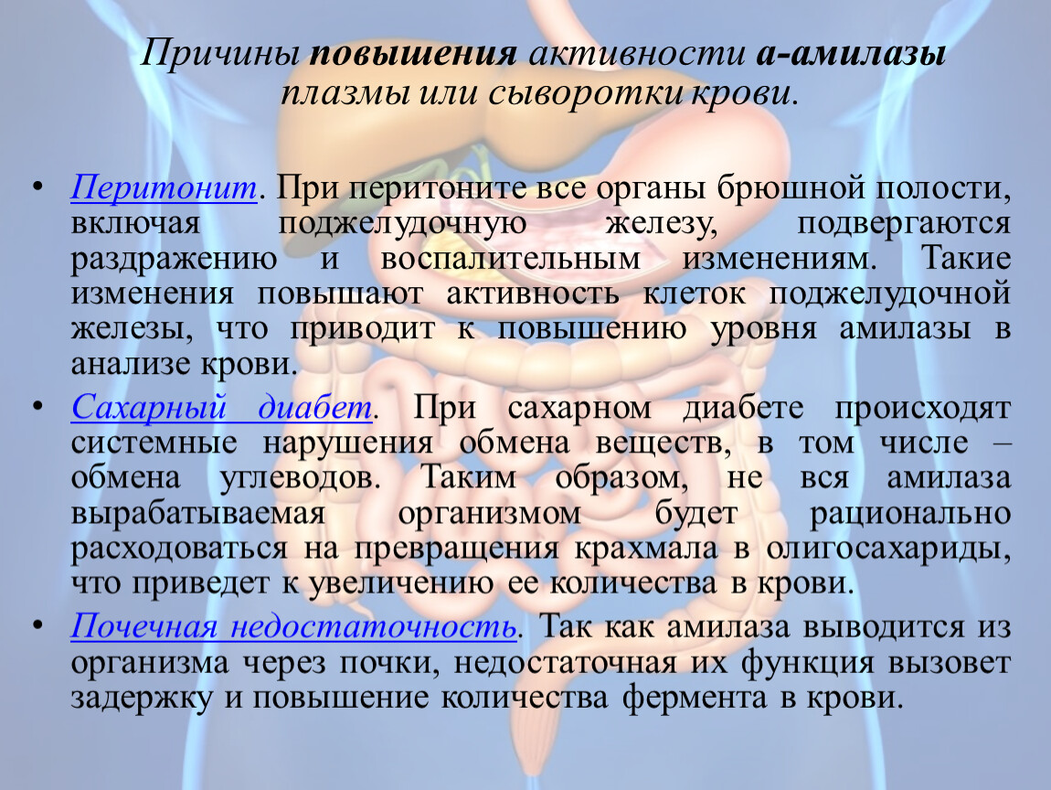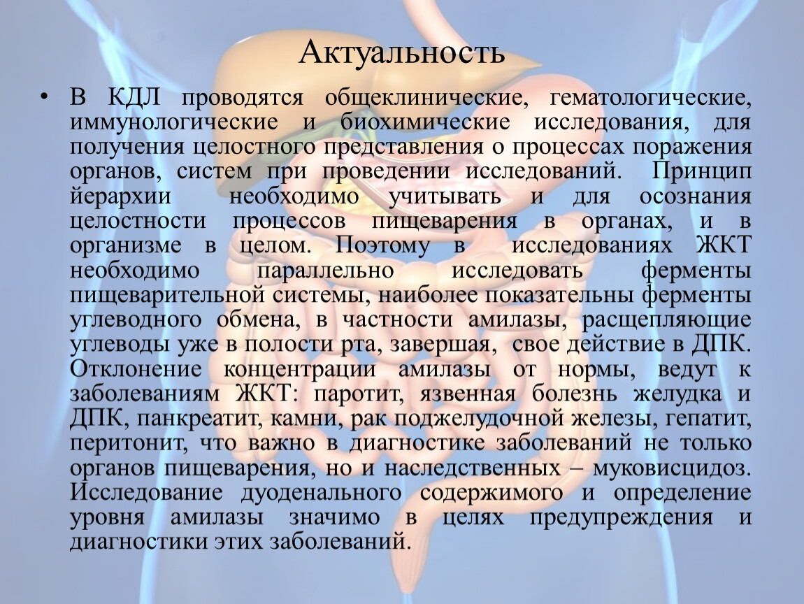 В КДЛ проводятся общеклинические, гематологические, иммунологические и биохимические исследования, для получения целостного представления о процессах поражения органов, систем при проведении исследований. Принцип йерархии необходимо учитывать и для осознания целостности процессов пищеварения в органах, и в организме в целом. Поэтому в исследованиях ЖКТ необходимо параллельно исследовать ферменты пищеварительной системы, наиболее показательны ферменты углеводного обмена, в частности амилазы, расщепляющие углеводы уже в полости рта, завершая, свое действие в ДПК. Отклонение концентрации амилазы от нормы, ведут к заболеваниям ЖКТ: паротит, язвенная болезнь желудка и ДПК, панкреатит, камни, рак поджелудочной железы, гепатит, перитонит, что важно в диагностике заболеваний не только органов пищеварения, но и наследственных – муковисцидоз. Исследование дуоденального содержимого и определение уровня амилазы значимо в целях предупреждения и диагностики этих заболеваний.