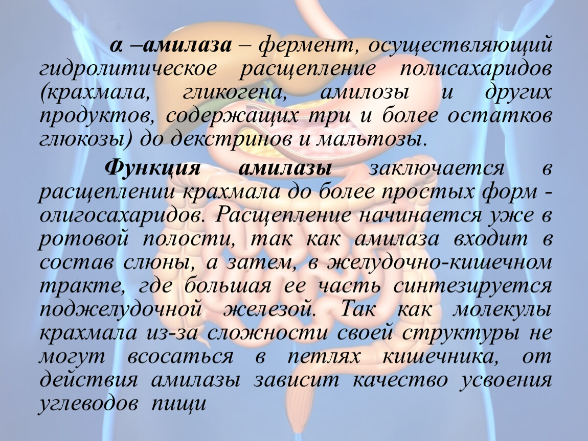 α –амилаза – фермент, осуществляющий гидролитическое расщепление полисахаридов (крахмала, гликогена, амилозы и других продуктов, содержащих три и более остатков глюкозы) до декстринов и мальтозы.