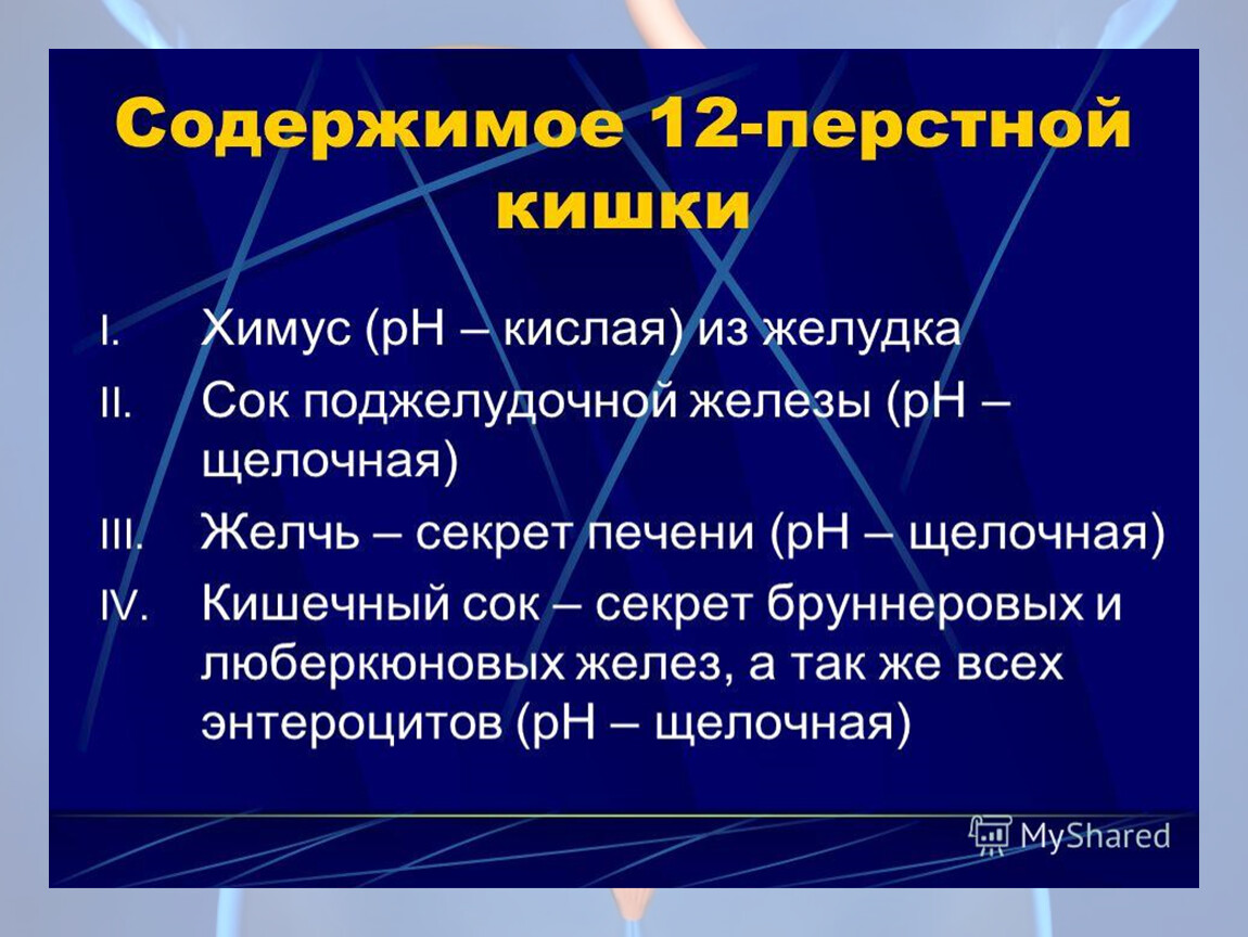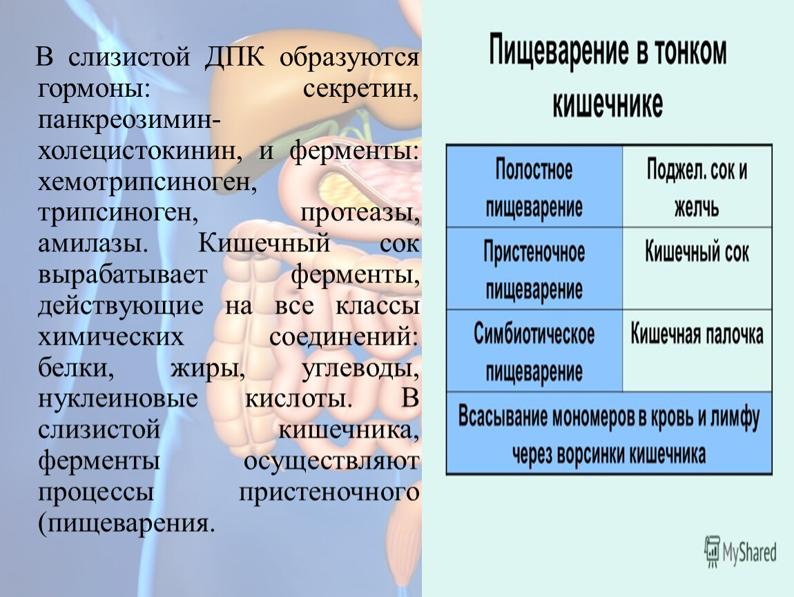 В слизистой ДПК образуются гормоны: секретин, панкреозимин-холецистокинин, и ферменты: хемотрипсиноген, трипсиноген, протеазы, амилазы. Кишечный сок вырабатывает ферменты, действующие на все классы химических соединений: белки, жиры, углеводы, нуклеиновые кислоты. В слизистой кишечника, ферменты осуществляют процессы пристеночного (пищеварения.